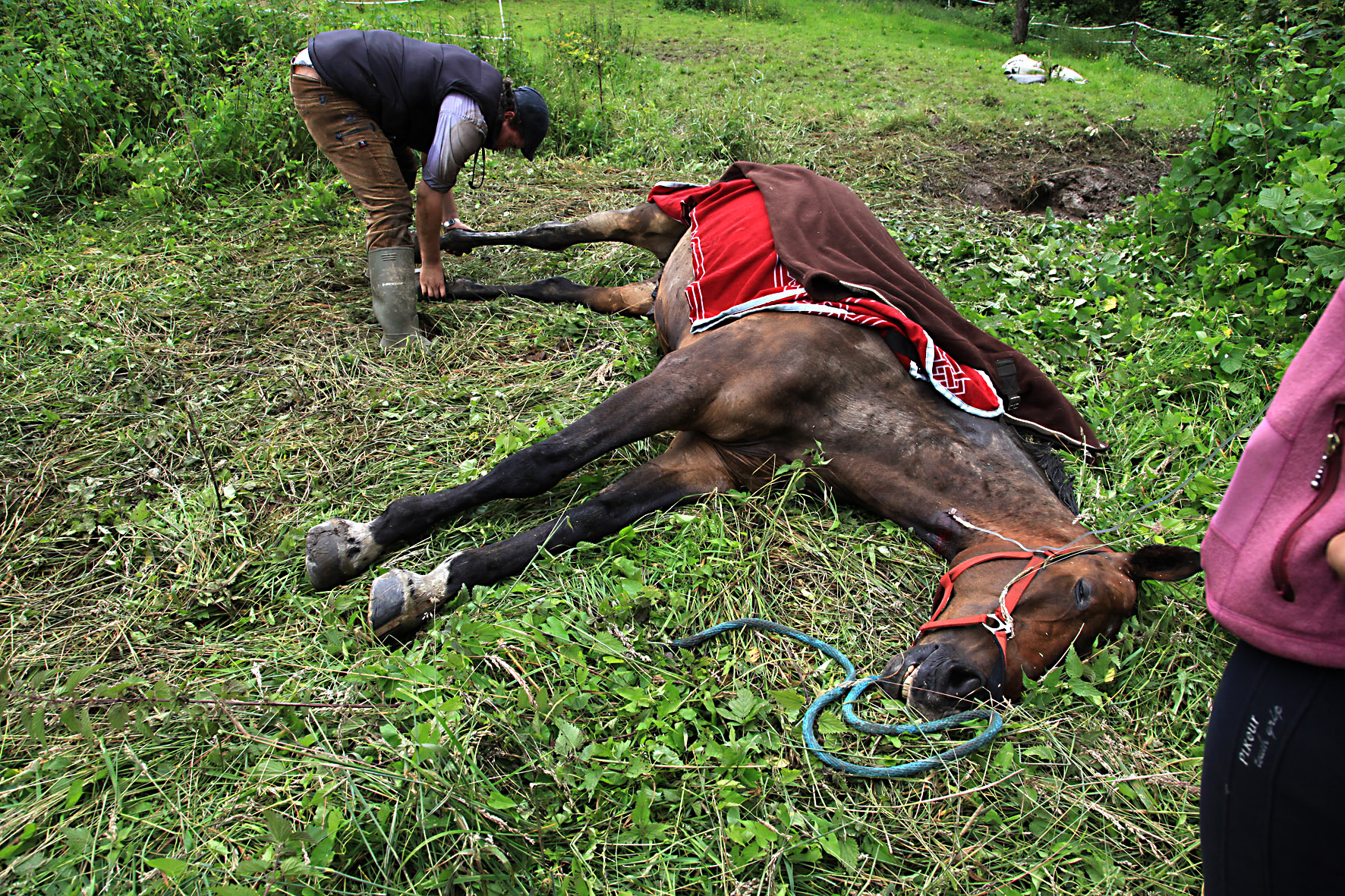 Essen-Byfang, Kleinheide, 21.06.2016, 11.55 Uhr (ots) - Ein 18 Jahre alter, rund 600 Kilogramm schwerer Wallach hat heute Vormittag (21.06.2016) in Essen Byfang verbotenes Terrain betreten. "Laptop" (Anm: Name des Tieres) hatte sich auf ein von seiner Weide abgeteiltes Gelände begeben und war dort in einen im Graben fließenden Bachlauf gerutscht. Als die Stallmeisterin des Reitervereins mittags die Tiere in den Stall holen wollte, bemerkte sie das Desaster. Sofort alarmierte sie die Feuerwehr und weitere ehrenamtliche Helfer. Bei Eintreffen der ersten Einsatzkräfte war klar, dass das eine anspruchsvolle Tierrettung werden würde. Die Zugänglichkeit zur Unglücksstelle führte über eine morastige, knöcheltiefe Wiese, eine Anfahrt mit schweren Fahrzeugen war unmöglich. An der gegenüberliegenden Seite stand zwar ein Radlader, wegen der Hanglage schied auch er als Hilfsmittel aus. Zu groß das Risiko, dass er unter Last vornüber kippen könnte. So entschied sich der Einsatzleiter für den Einsatz der hydraulischen Seilwinde des Feuerwehrkranes. Das Seil wurde so weit wie möglich abgerollt und mit zwei zusätzlichen Drahtseilen auf die richtige Länge gebracht. Der zwischenzeitlich eingetroffene Tierarzt gab dem Unglücksraben Beruhigungsmittel, und dann führten Feuerwehrleute und Arzt eine Schlinge unter dem Tier hindurch. Keine leichte Aufgabe im Morast und fließenden Wasser. Mehrere Ansätze und viel Fingerspitzengefühl beim Bedienen der Seilwinde waren nötig, bis Laptop nach knapp zwei Stunden schließlich auf festem, ebenen Boden lag. Der Tierarzt verabreichte kreislaufstabilisierende Mittel, eine Infusion tat ihr Übriges. Nach etwa einer Stunde wachte Laptop langsam auf, und seither versuchte er bereits mehrfach, auf die Beine zu kommen. Nach aktuellen Informationen (21.06.2016, 17.30 Uhr) ist das jedoch noch nicht gelungen, die Situation hat das Tier wohl sehr stark belastet. (MF)