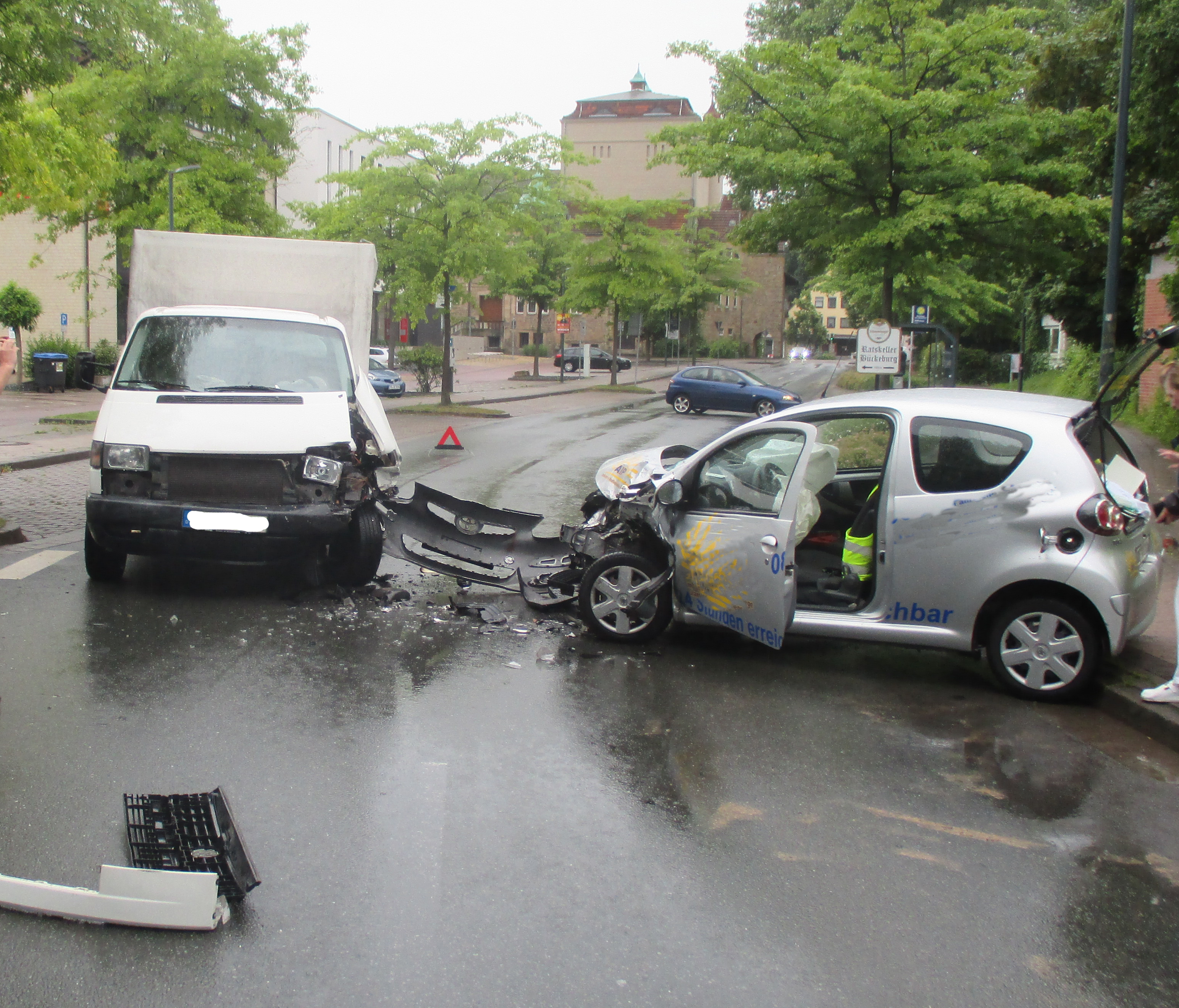 Beim Durchfahren einer Linkskurve hat gestern gg. 19.45 Uhr eine aus Richtung Gartenstraße kommende 52jährige Pkw-Fahrerin in Bückeburg am Oberstenhof die Kontrolle über ihren Pkw verloren und stieß mit einem entgegenkommenden Kleintransporter zusammen.