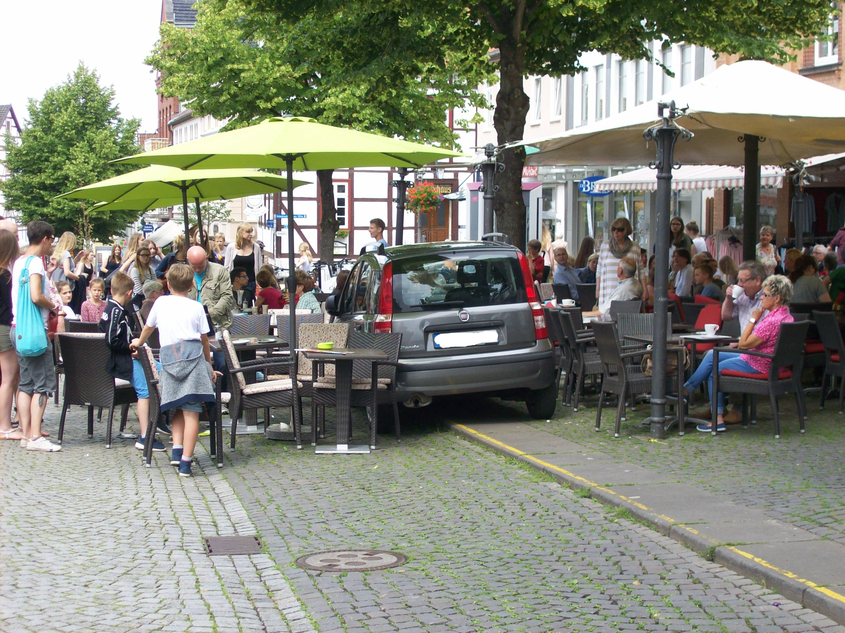 Die eine oder andere Tasse Cappuccino schwappte über, Geschirr ging zu Bruch und mancher Besucher der Eisdiele in der Bückeburger Fußgängerzone leckte aufgeregt an seiner Eiswaffel, weil ein Kurierfahrer seinen Pkw Fiat nicht ordnungsgemäß gegen mögliches Wegrollen gesichert hatte und in die Bestuhlung des Eiscafe nahe des Kinos gerollt war.