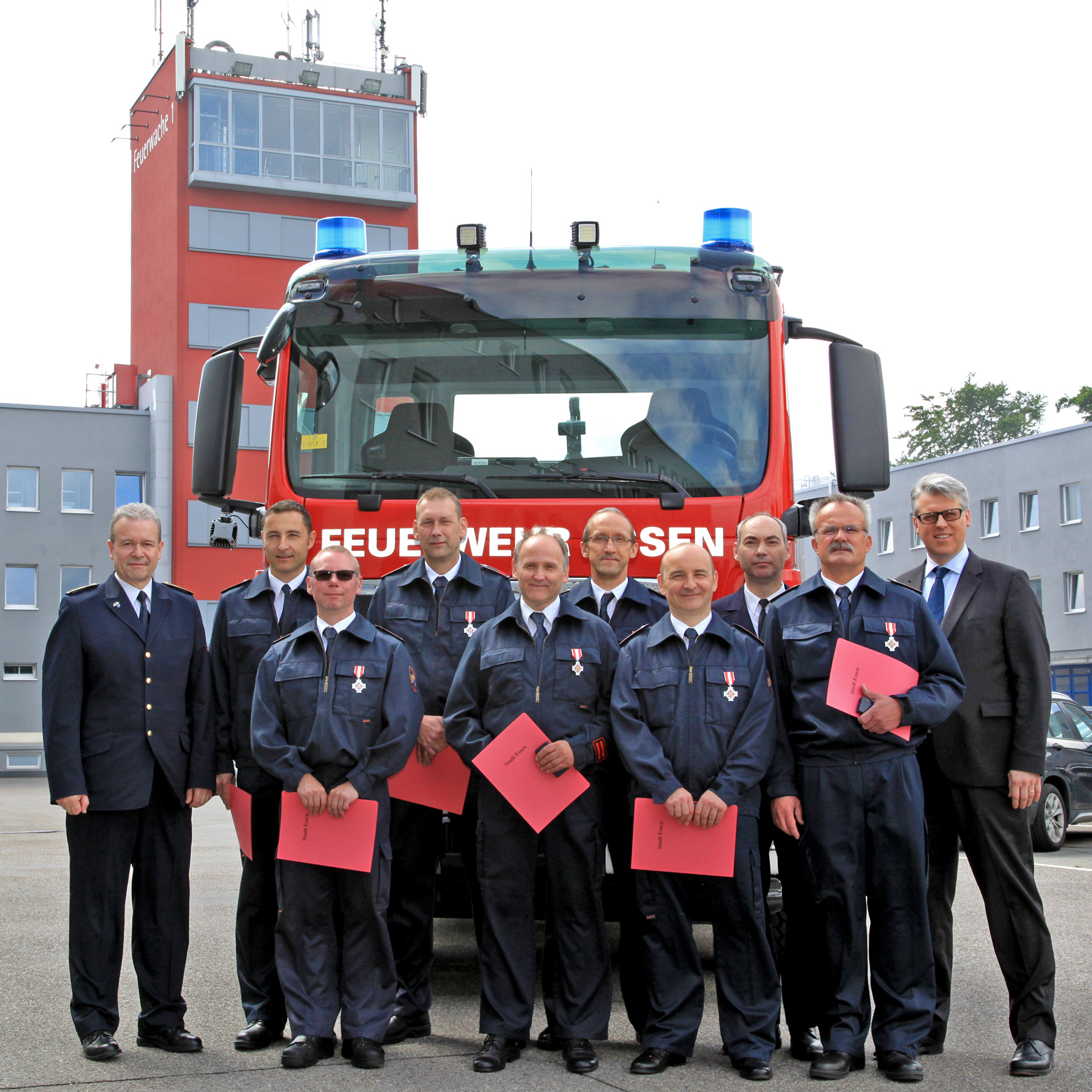 Essen-Ostviertel, Eiserne Hand 45, 29.06.2016 (ots) - Acht Kollegen des Einstellungsjahrganges 1991 haben heute das Feuerwehr-Ehrenzeichen in Silber für 25 Jahre treue Pflichterfüllung bekommen. Feuerwehr-Dezernent Christian Kromberg überreichte den Mitarbeitern entsprechende Urkunden der Landesregierung, das Anstecken der Ehrenzeichen übernahm traditionsgemäß Amtsleiter Ulrich Bogdahn. "Es ist wichtig, dass Ihre Professionalität vor Ort bei den Bürgerinnen und Bürgern zum Tragen kommt", so Kromberg in seiner Ansprache. "Sie sind seit vielen Jahren sehr erfolgreich dabei und geben Ihre Erfahrung auch an die jüngere Generation weiter. Ich erlebe es immer wieder, wenn neue Kameradinnen und Kameraden kommen, dass dann Ihr Gedankengut und Ihre Werte auf diese neuen Kolleginnen und Kollegen übertragen werden. Ihnen dafür heute zu danken, ist mir ein persönliches Bedürfnis und eine große Freude." Auch den Dank von Essens Oberbürgermeister Thomas Kufen sprach Kromberg ausdrücklich aus. (MF)