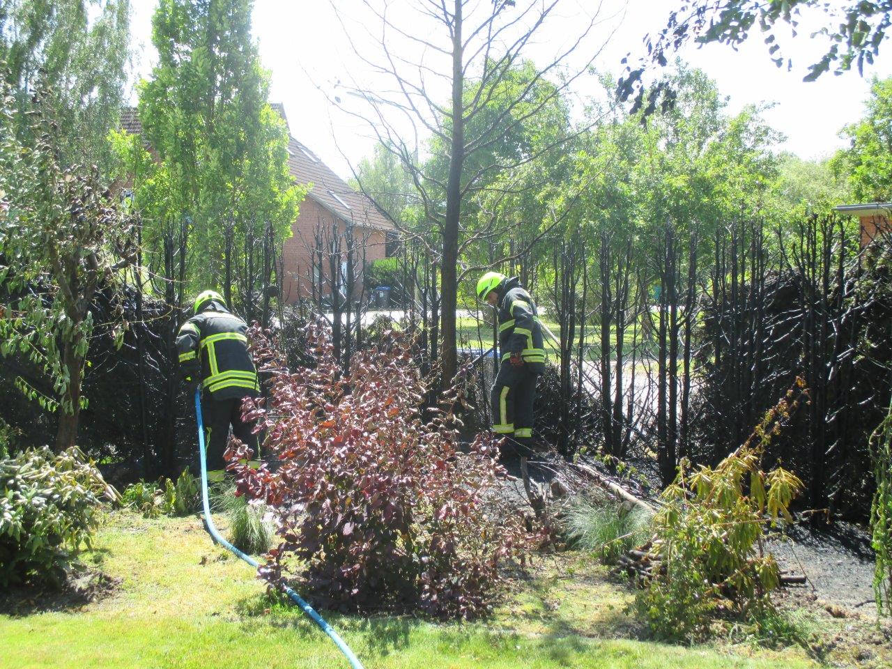 Dem Grundstücksbesitzer wird nun ein erheblicher Teil seiner Hecke auf ca. 15-20 Metern fehlen, die die Freiwillige Feuerwehr löschen musste.