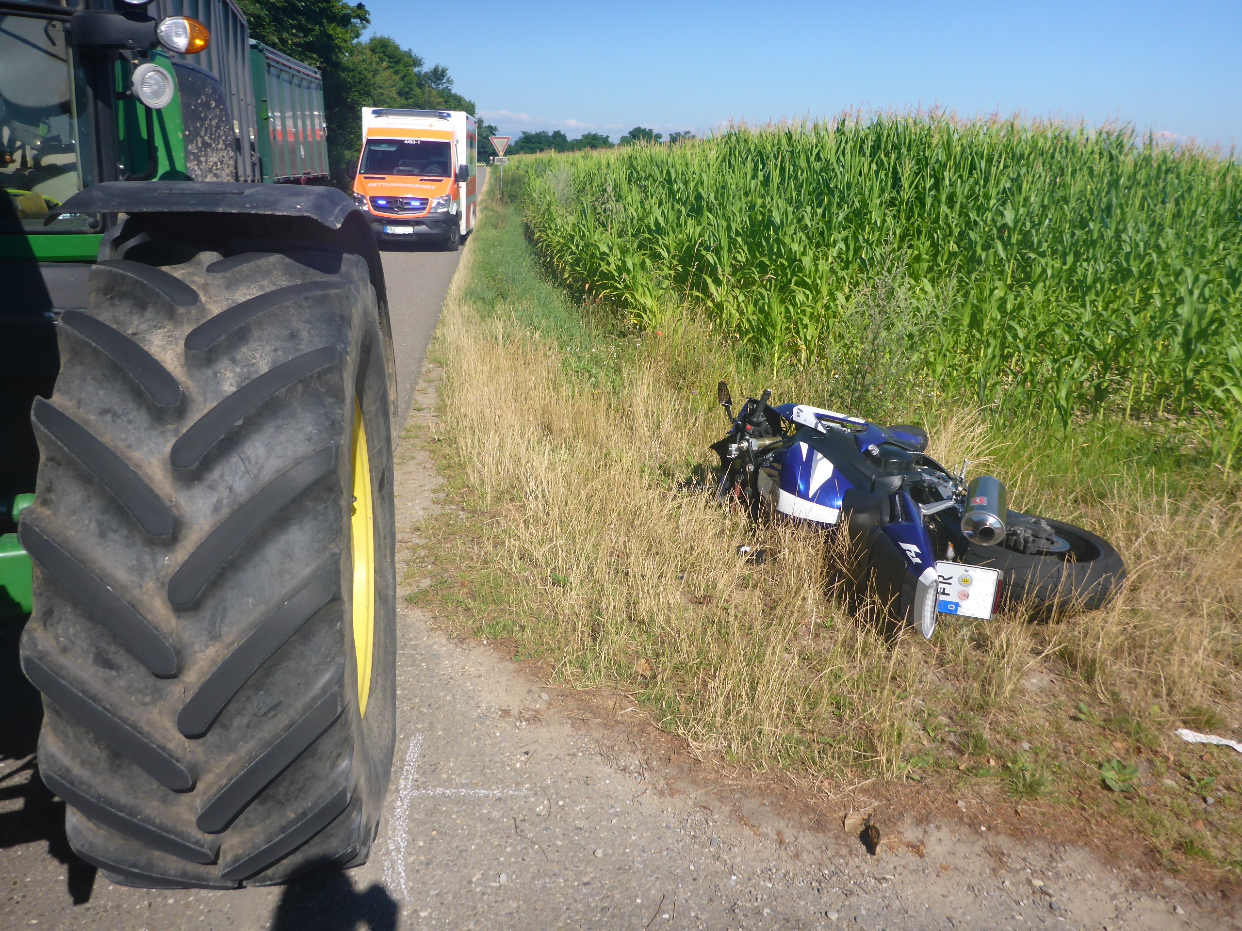 Freiburg (ots) - Glimpflich endete ein Verkehrsunfall, welcher sich am Montagmorgen, 18. Juli, gegen 09.30 Uhr auf dem Breitenweg zwischen der L 134 und der B3 im Bereich Neuenburg ereignet hatte. Ein zügig fahrender Motorradfahrer überholte auf dem Breitenweg zunächst einen Pkw und im Anschluss einen Traktor mit Anhänger. Offensichtlich übersah der 68-jährige Motorradfahrer, dass der Traktor im Begriff war nach links auf einen Feldweg abzubiegen. Der 68-Jährige kollidierte schließlich mit dem Traktor, stürzte und musste aufgrund seiner Verletzungen in einer Klinik ärztlich versorgt werden. Zu Folgenschweren Verletzungen kam es jedoch nicht. Es entstand Sachschaden in Höhe von etwa 4.000 Euro.