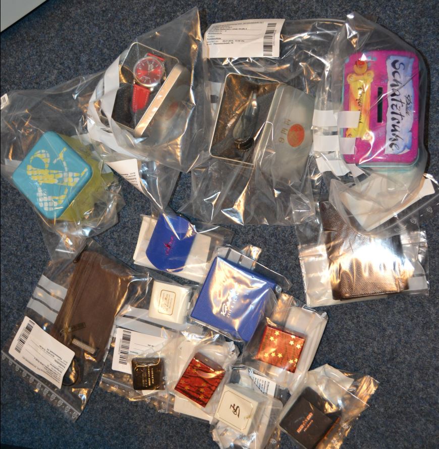 Nienburg (ots) - NIENBURG (mue) - Die Polizei Nienburg sucht die Eigentümer der abgebildeten Gegenstände, die im Zuge einer polizeilichen Sachverhaltsaufnahme sichergestellt wurden. Demnach wurde am Freitag, 29.07.16, eine Tüte mit verschiedenen Schmuckverpackungen der nienburger Juweliere Schnauer, May und Müller, sowie Fossil Blechdosen, eine Diddl-Spardose, 2 Portemonnaies und 2 Werbeuhren der Marke WMG aufgefunden. Es wird angenommen, dass diese Gegenstände aus einem oder mehreren Diebstählen stammen. Wer Angaben zur Herkunft der abgebildeten Gegenstände machen kann, möge sich bitte bei der Polizei Nienburg, Telefon 05021/9778421 oder 05021/97780, melden.
