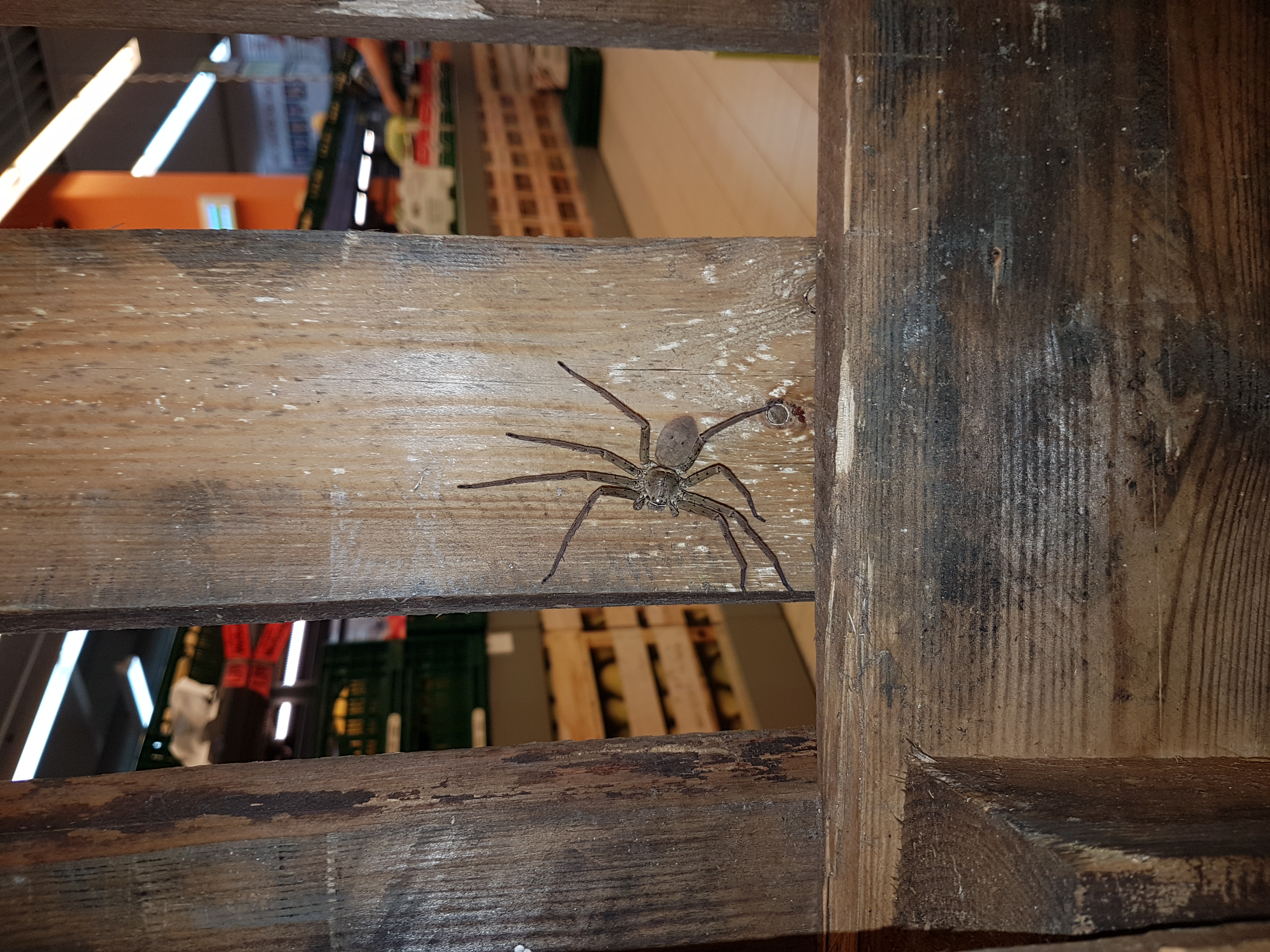 Ein anschauliches Beispiel für die Angst mancher Menschen vor Spinnen gab es am Dienstagmorgen in Lörrach. Um 7 Uhr teilten Mitarbeiter eines Einkaufsmarktes mit, dass beim Aufbau von Bananenkörben plötzlich eine Riesenspinne aufgetaucht sei und unter einer Palette verschwunden ist. Eine Streife begab sich vor Ort, "umstellte" die Palette und forderte einen Experten aus eigenen Kreisen an. Nach kurzer Lagebesprechung schritt der unerschrockene Beamte zur Tat und fing das behaarte Krabbeltier ein. Nach einer ersten Begutachtung handelt es sich vermutlich um eine "Heteropoda Venatoria" (Riesenkrabbenspinne) mit einem Durchmesser von ca. 10 cm. Sie soll ungefährlich, ihr Biss aber schmerzhaft sein. Derzeit wird abgeklärt, wohin die, aller Wahrscheinlichkeit nach eingeschleppte Spinne gebracht wird.