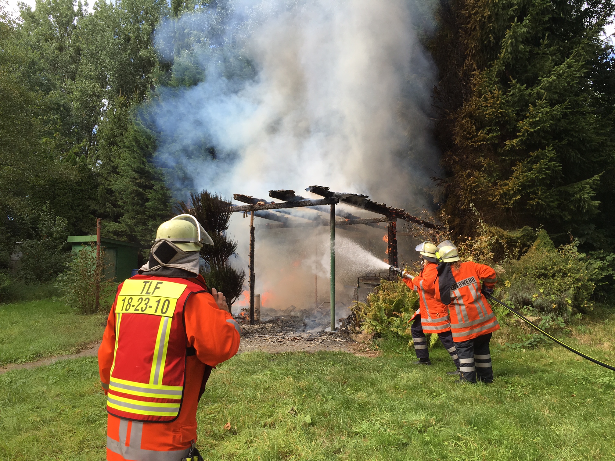 Eine auf dem Teichgelände stehende Holzhütte stand beim Eintreffen der ersten Einsatzkräfte in Vollbrand und wurde vollständig zerstört. Der Brand wurde gegen 12.15 Uhr der Kooperativen Regionalleitstelle gemeldet.