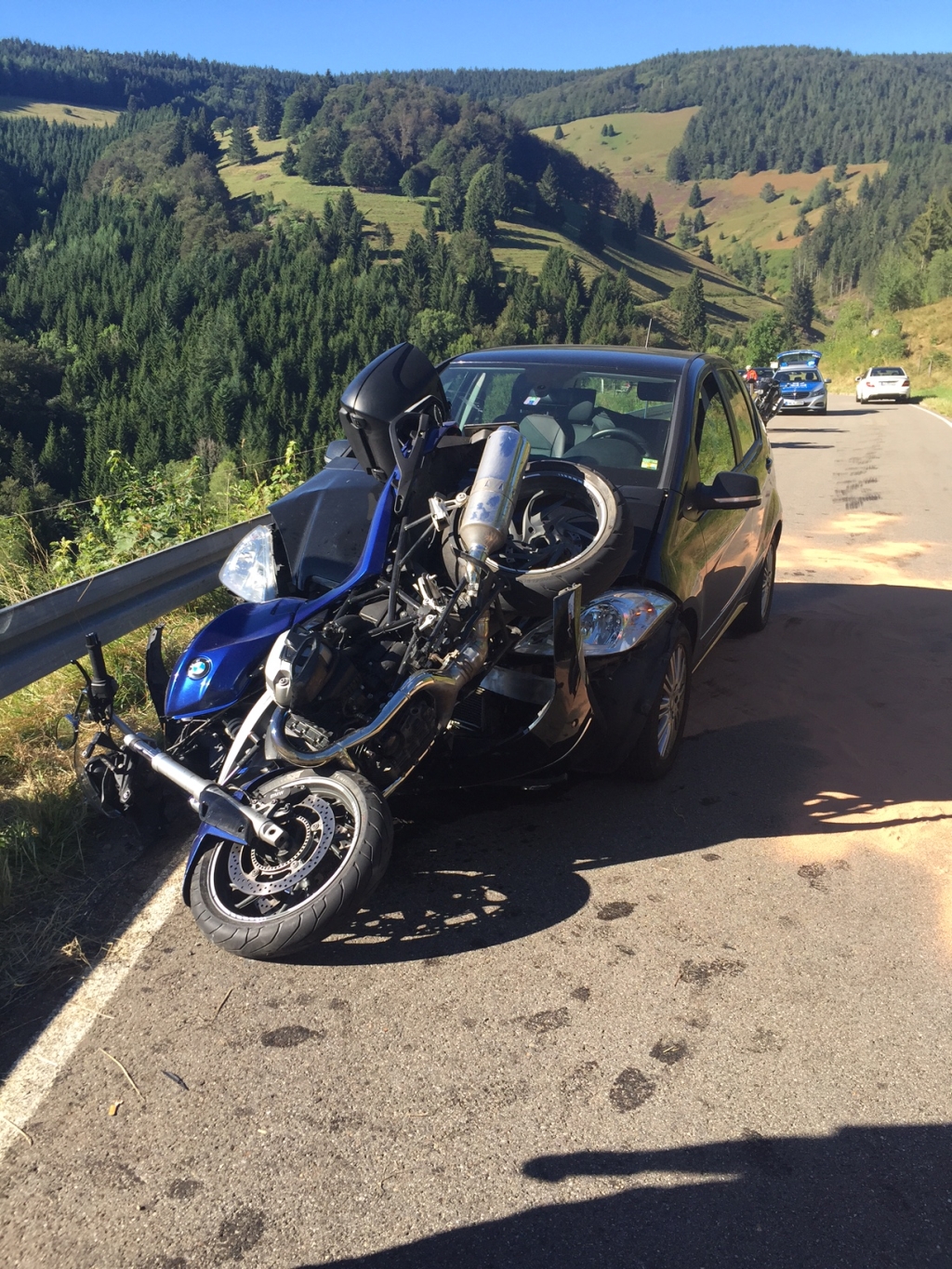 Freiburg (ots) - Ein spektakulärer Unfall mit glimpflichen Folgen ereignete sich am Dienstagnachmittag gegen 16.20 Uhr auf der Landstraße zwischen Happach und Forsthof. Ein 65 Jahre alter Motorradfahrer fuhr als letzter in einer Gruppe von fünf Motorrädern talwärts. In einer unübersichtlichen Rechtskurve kam er beim Abbremsen auf die linke Straßenseite und stieß frontal mit einem entgegenkommenden A-Klasse Mercedes zusammen. Bei der Kollision verkeilte sich das Motorrad in der Fahrzeugfront des Pkws, das Motorrad wurde gedreht und landete auf der Motorhaube, der Motorradfahrer stürzte über die Windschutzscheibe des Pkws zu Boden. Er zog sich bei dem Unfall zum Glück nur leichte Verletzungen zu, die vor Ort von Notarzt und Rettungsdienst versorgt werden konnten. Die Feuerwehr Häg-Ehrsberg war mit zwei Fahrzeugen und 15 Einsatzkräften zur Hilfeleistung ausgerückt. Sie bargen das Motorrad und reinigten die Fahrbahn von ausgelaufenen Betriebsstoffen.