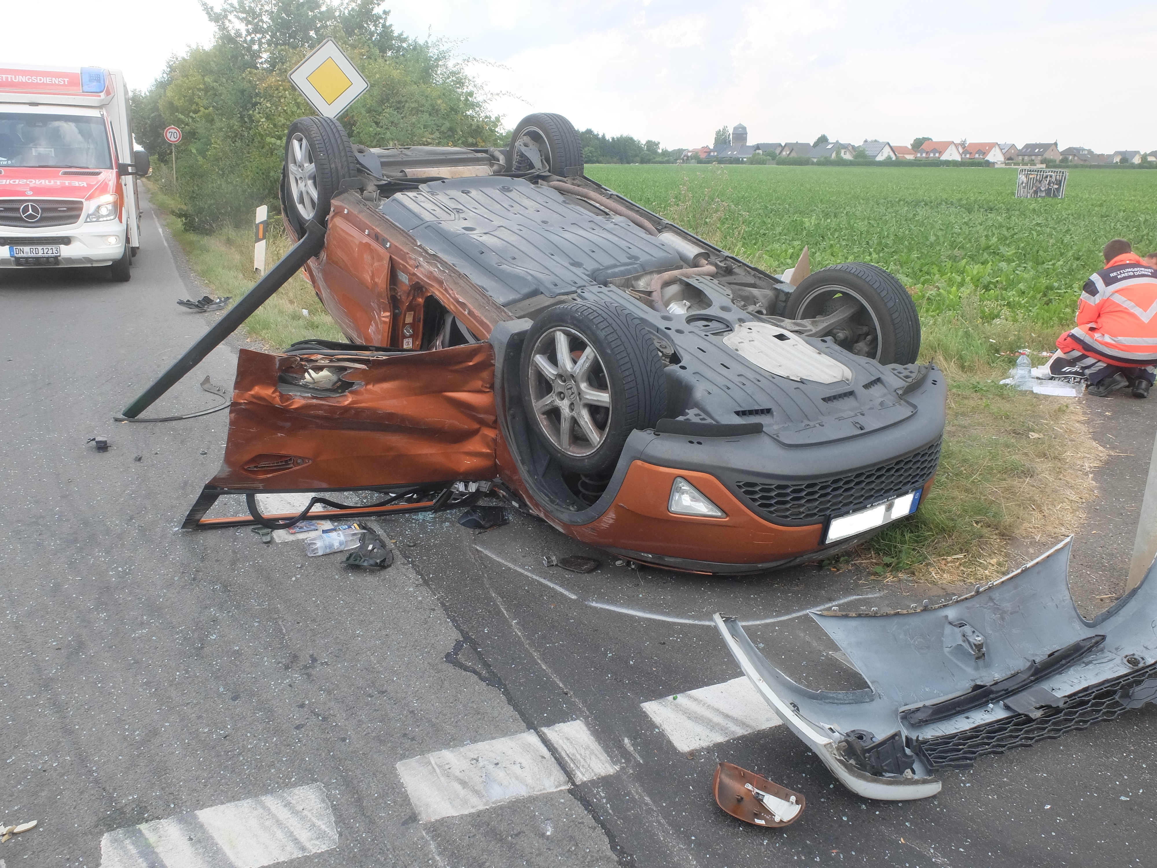 Die 19-Jährige, so der Stand der ersten Ermittlungen, hatte jedoch an der Kreuzung die Vorfahrt des aus ihrer Sicht von rechts kommenden Erftstädters nicht beachtet, so dass es zu einer heftigen Kollision der beiden Fahrzeuge kam. Dabei überschlug sich der Wagen des 30-Jährigen, der sich mit seiner 25 Jahre alten Beifahrerin aus dem auf dem Dach liegen gebliebenen Fahrzeug befreien musste.