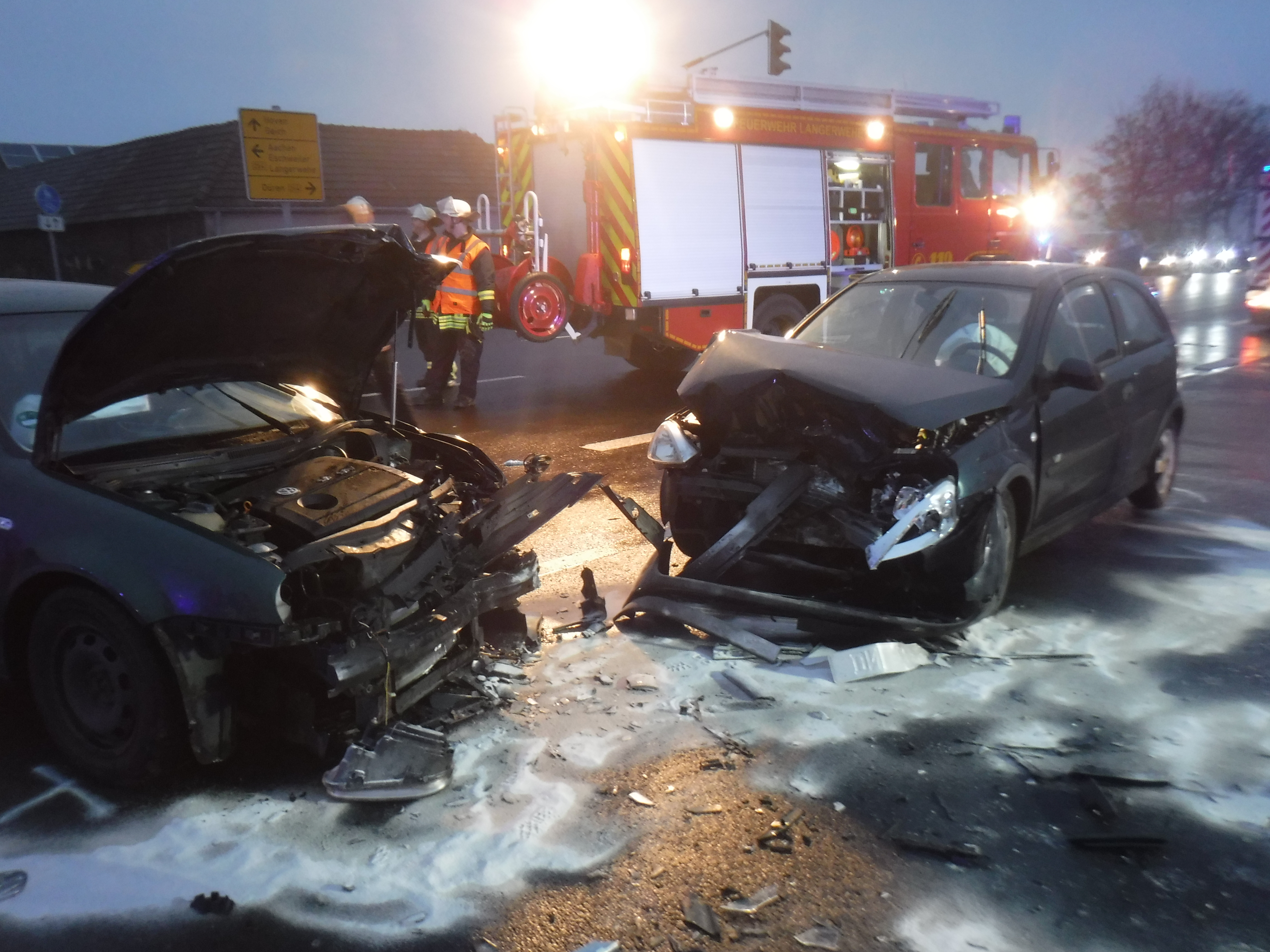 Kurz vor 07:00 Uhr befuhr ein 19 Jahre alter Mann aus Eschweiler die Straße "In der Klaus" in Fahrtrichtung der Bundesstraße. Dort beabsichtigte er, nach links in Richtung Langerwehe abzubiegen. Gleichzeitig näherte sich ein 48-Jähriger aus Düren auf der B 264 aus Richtung Langerwehe in Richtung Düren. Dann kam es zum Zusammenstoß: der abbiegende 19-Jährige missachtete die Vorfahrt seines Kontrahenten und beide Pkw prallten ineinander. Dabei wurden die Fahrer verletzt. Sie mussten mit RTW in umliegende Krankenhäuser transportiert werden. Der 48-Jährige verblieb zur Behandlung stationär. Ihre nicht mehr fahrbereiten Wagen wurden von der Unfallstelle abtransportiert. Diese war für die Dauer der Unfallaufnahme kurzzeitig gesperrt und ab etwa 08:35 Uhr wieder gänzlich befahrbar.