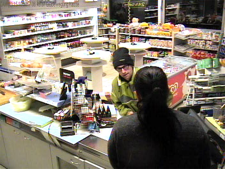 Die beigefügten Bilder einer Überwachungskamera zeigen den Täter. Die Polizei fragt: "Wer kennt diesen Mann und kann Angaben zu seinem Aufenthaltsort machen?"