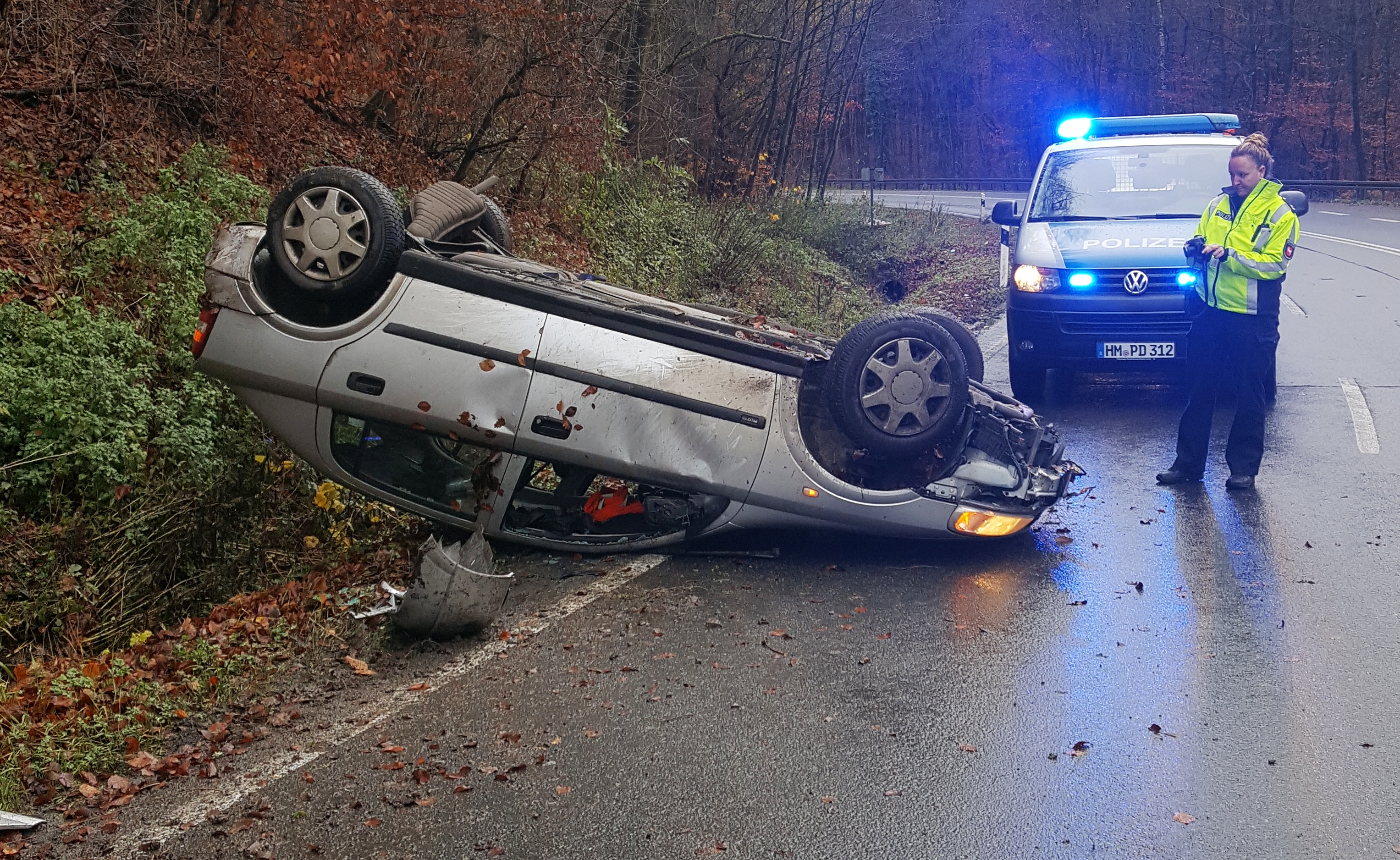 Am Samstag, 25.11.2017, gegen 11.30 Uhr, verunglückte auf der Landesstraße 434 zwischen Rehren und Hess. Oldendorf ein 34-jähriger Mann aus Osnabrück mit einem Opel Astra. Der Opel fuhr von Rehren in Richtung Hess. Oldendorf. In einer Linkskurve am Rohdener Berg verlor der 34-Jährige auf regennasser Fahrbahn die Kontrolle über sein Fahrzeug, schleuderte über die Gegenfahrbahn und überschlug sich am Fahrbahnrand (Foto). Der Opel-Fahrer wurde leicht verletzt.