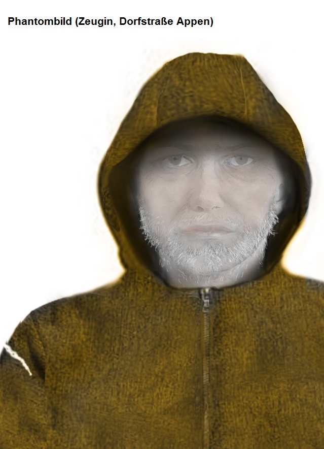 Gegen 20:30 Uhr traf eine unbeteiligte Zeugin in der Dorfstraße in Appen auf den mutmaßlich flüchtenden Täter. Die Täterbeschreibung durch die verletzte Geschädigte und die Zeugin sind weitestgehend deckungsgleich. Sowohl mit der Geschädigten als auch mit der Zeugin wurde je ein Phantombild erstellt.