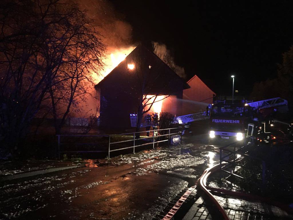 Bei Eintreffen der Einsatzkräfte standen der Dachstuhl des zweigeschossigen Wohnhauses sowie die angrenzende Scheune an der Kruggasse in Vollbrand. Einzelne Gebäudebereiche waren bereits in sich zusammengestürzt. Auch die beiden Wohnebenen waren vom Brand betroffen.