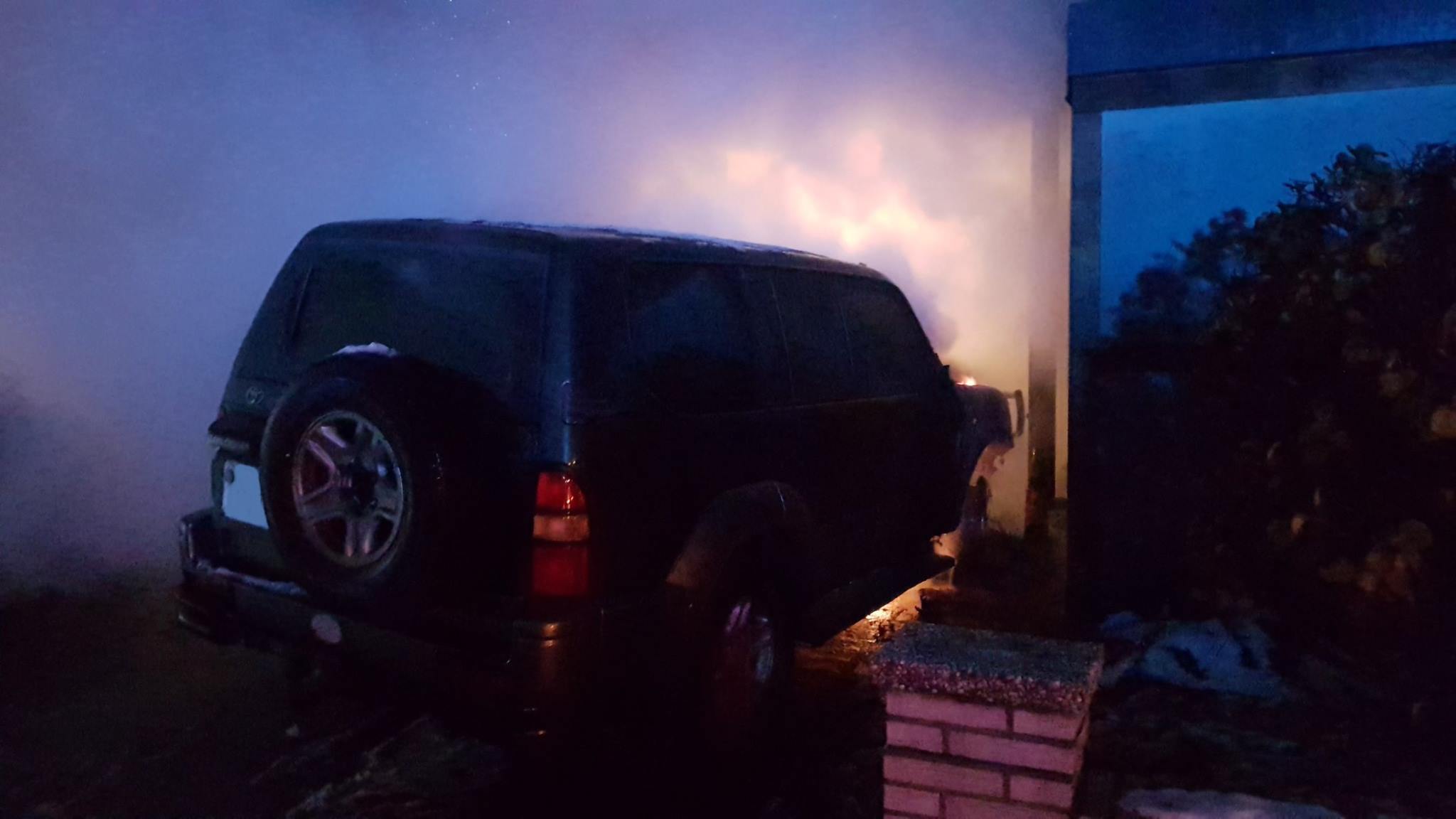Der Brand im vorderen Bereich eines abgestellten Geländewagens griff auf abgestellte Abfallbehälter und dem Ständerwerk des Carports über.