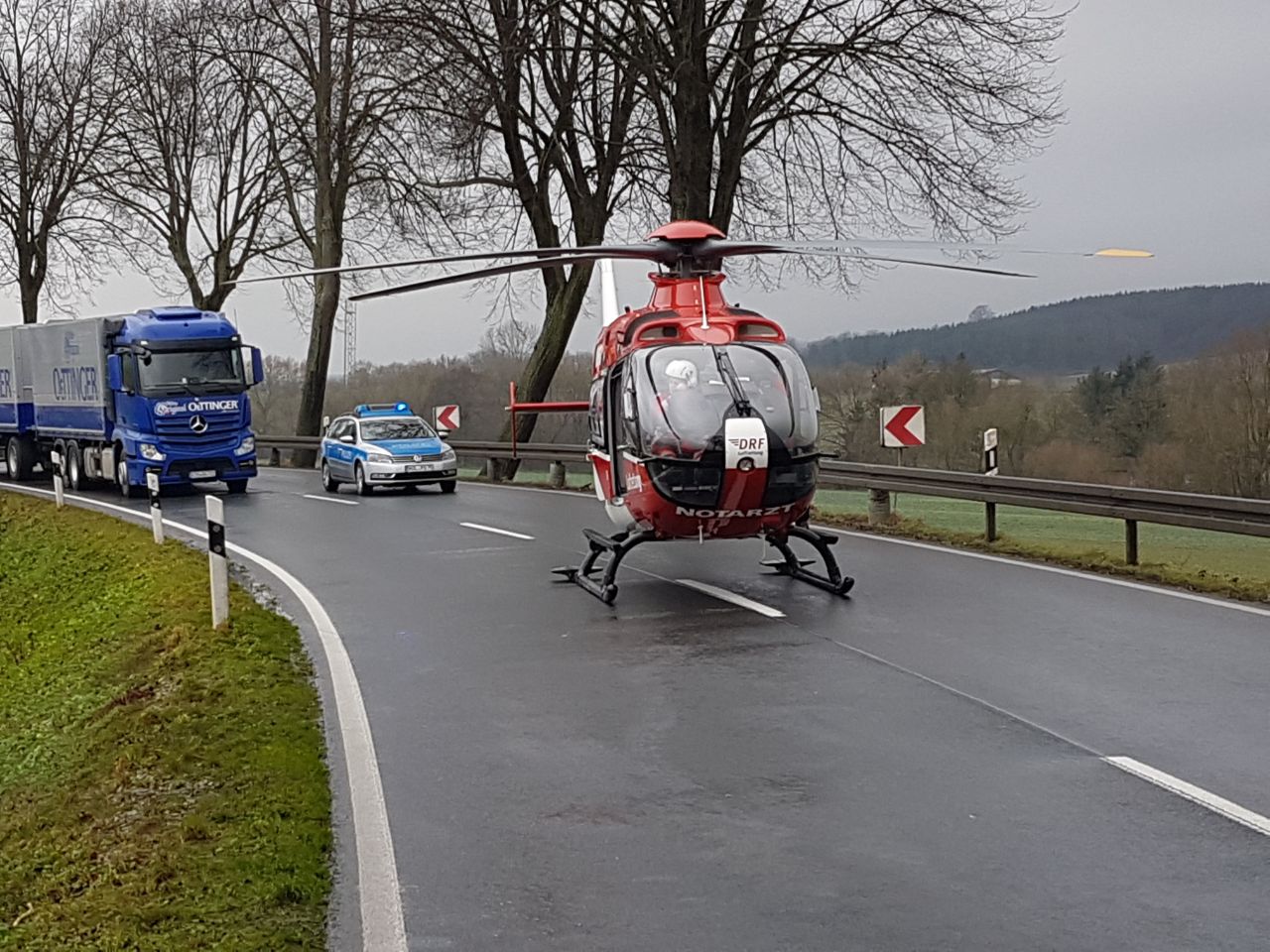 Die Unfallstelle ist während der Unfallaufnahme längerfristig gesperrt, eine Rundfunkwarnmeldung wurde veranlasst, der Verkehr wird über nahe gelegene Kreisstraßen abgeleitet. Eingesetzt sind zahlreiche Fahrzeuge des Rettungsdienstes, der Feuerwehren sowie Polizei.