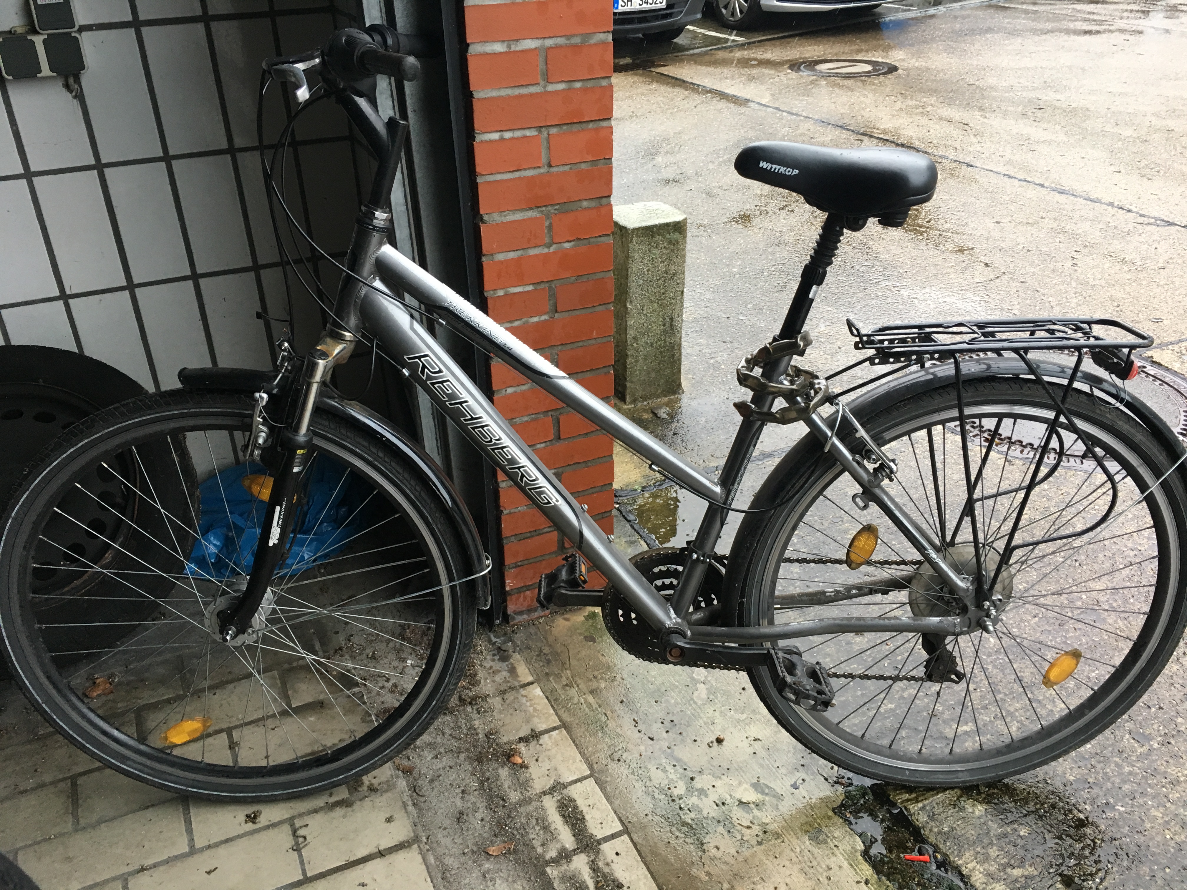 Es handelt sich um ein Damenrad des Herstellers "Rehberg", Modell "Trekking 1.4", Farbe grau, bei dem ein Griff am Lenker beschädigt ist.