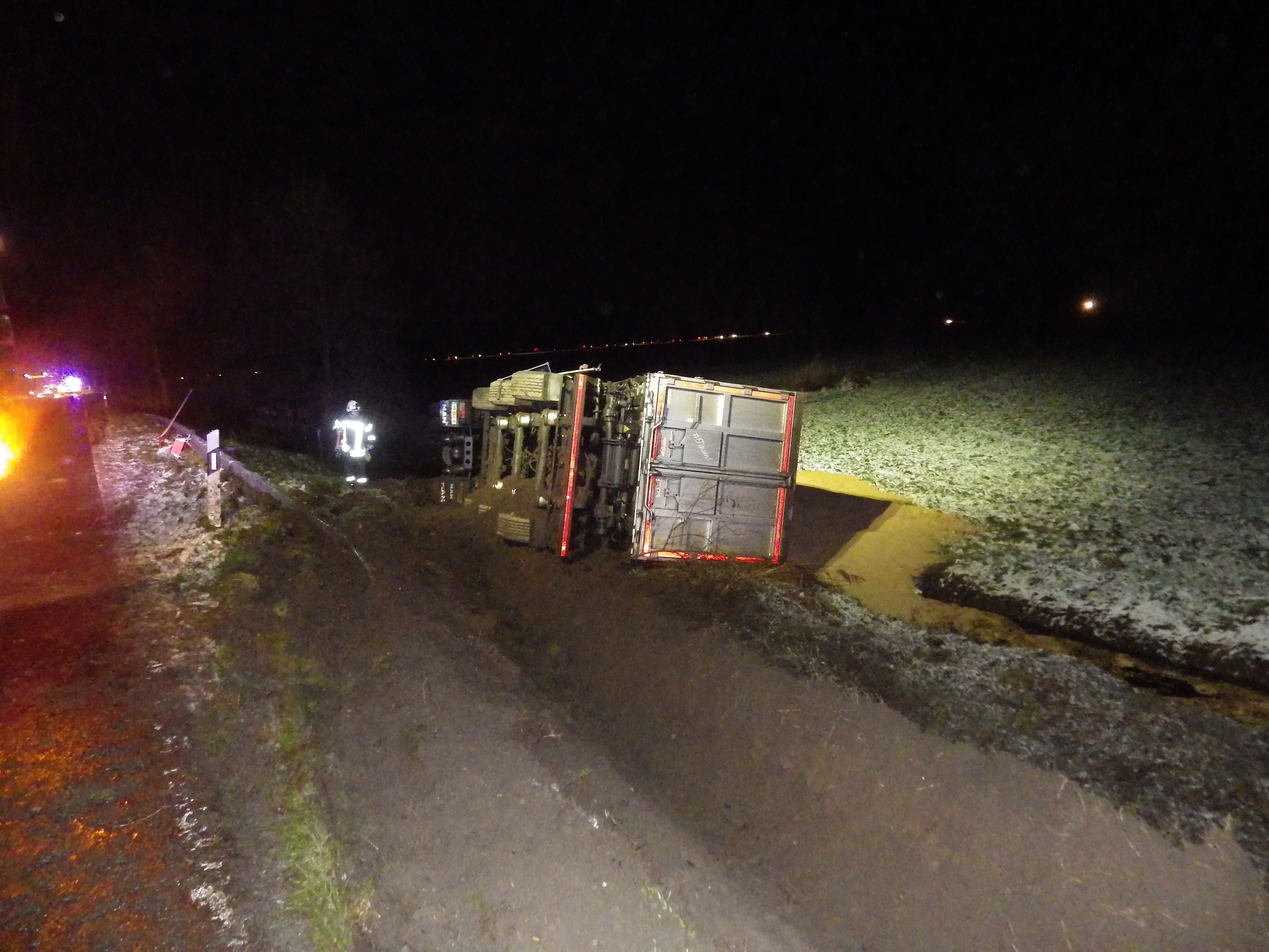 Um 18:09 Uhr befuhr ein 20-jähriger Mann aus den Niederlanden mit einem niederländischen Sattelzug, beladen mit 20 Tonnen Hafer, die L120 zwischen den Ortschaften Bad Bederkesa und Drangstedt. Aus bislang ungeklärter Ursache kam er dabei nach rechts von der Fahrbahn ab. Aufgrund des aufgeweichten und abschüssigen Seitenraums konnte der Fahrzeugführer das Gespann nicht mehr halten und der gesamte Sattelzug kippte auf die Seite. Durch den Unfall wurde der Fahrzeugführer leicht verletzt, er wurde in ein Krankenhaus verbracht. Es entstand ein Sachschaden von ca 50.000 Euro. Die Bergung des Sattelzgus erfolgt am heutigen Vormittag ab 08:00 Uhr. Für die Bergung, Dauer vermutlich 4-5 Stunden, wird die L120 in beide Fahrtrichtungen voll gesperrt werden. (Lichtbild im Anhang)