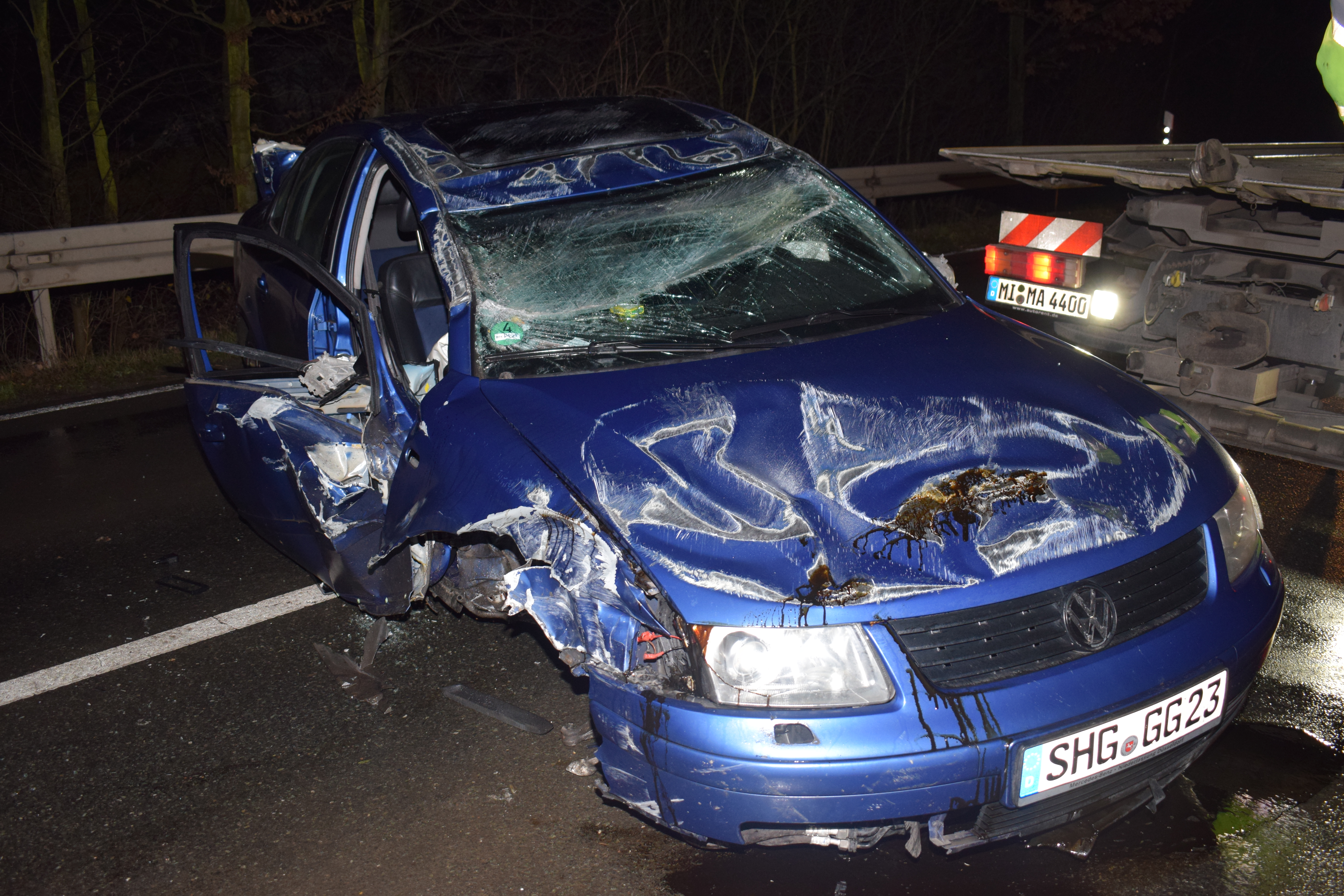 Stadthagen, OT Hobbensen (ots) - In der Nacht von Freitag auf Samstag kam es auf der Eisenbahnüberführung der Hobbenser Straße zu einem Verkehrsunfall der nicht alltäglichen Art. Ein 26jähriger Helpser befuhr gegen 23:20 Uhr die Brücke aus Meerbeck kommend in Richtung Enzen. Dabei geriet er vermutlich aufgrund nicht angepasster Geschwindigkeit nach rechts von der Fahrbahn ab, überfuhr mit dem Fahrzeugunterboden die ansteigende Leitplanke und kollidierte dann mit einem Geländer. Durch die Wucht des Aufpralls wurde der Pkw zurück auf die Fahrbahn geworfen und landete auf dem Dach. Anschließend rutschte der Pkw noch ca. 150 Meter weiter und kam auf der Gegenfahrbahn zum Liegen. Der alleinbeteiligte Fahrzeugführer wurde bei diesem Unfall wie durch ein Wunder nur leicht verletzt und konnte sich selbstständig aus dem schwer beschädigten Fahrzeug befreien. Bei der Unfallaufnahme wurde bei dem Mann Alkoholgeruch festgestellt. Eine Blutprobenentnahme wurde angeordnet und der Führerschein sichergestellt.