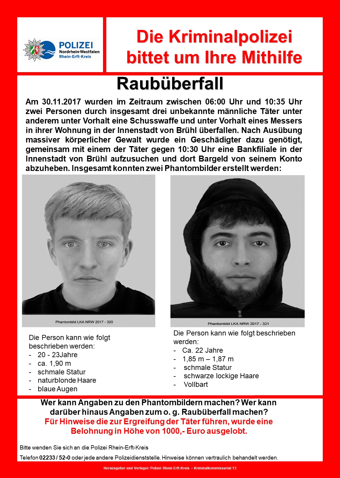 Drei unbekannte Personen klopften am Donnerstag, 30. November, gegen 05.30 Uhr zunächst an eine Wohnungstür eines Mehrfamilienhauses der Comesstraße. Anschließend drangen sie mit einer Schusswaffe und einem Messer in die Wohnung ein, in der sich zwei Männer (18/23) aufhielten. Beim Betreten gaben die Täter Schüsse in die Luft ab. Die Unbekannten verletzten den 23-Jährigen mit einem Messer am Bein und weiteren Schlägen derart, dass dieser stationär in einem Krankenhaus behandelt werden musste. Der 18-Jährige ging gemeinsam mit einem der Täter gegen 10:30 Uhr zu einer Bankfiliale in der Innenstadt von Brühl. Dort hob er Bargeld von seinem Konto ab und übergab dieses einem Täter. Die Täter flüchteten anschließend in unbekannte Richtung. Zwei der drei Täter konnten durch die beiden Geschädigten wie folgt beschrieben werden: Der erste Täter war etwa 20 bis 23 Jahre alt, 190 Zentimeter groß und von schmaler Statur. Er hatte naturblonde Haare und blaue Augen. Der zweite Täter war etwa 22 Jahre alt, 185 bis 187 Zentimeter groß und von schmaler Statur. Dieser hatte schwarze, lockige Haare und einen Vollbart. Die Polizei fertigte Phantombilder der beiden Täter an, die auf dem beigefügten Fahndungsplakat zu sehen sind. Für Hinweise, die zu der Ergreifung der Täter führen, ist eine Belohnung in Höhe von 1000,- Euro ausgelobt. Das Kriminalkommissariat 13 in Hürth führt die Ermittlungen, die andauern. Hinweise nimmt die Polizei unter der Rufnummer 02233 52-0 entgegen. (wp)