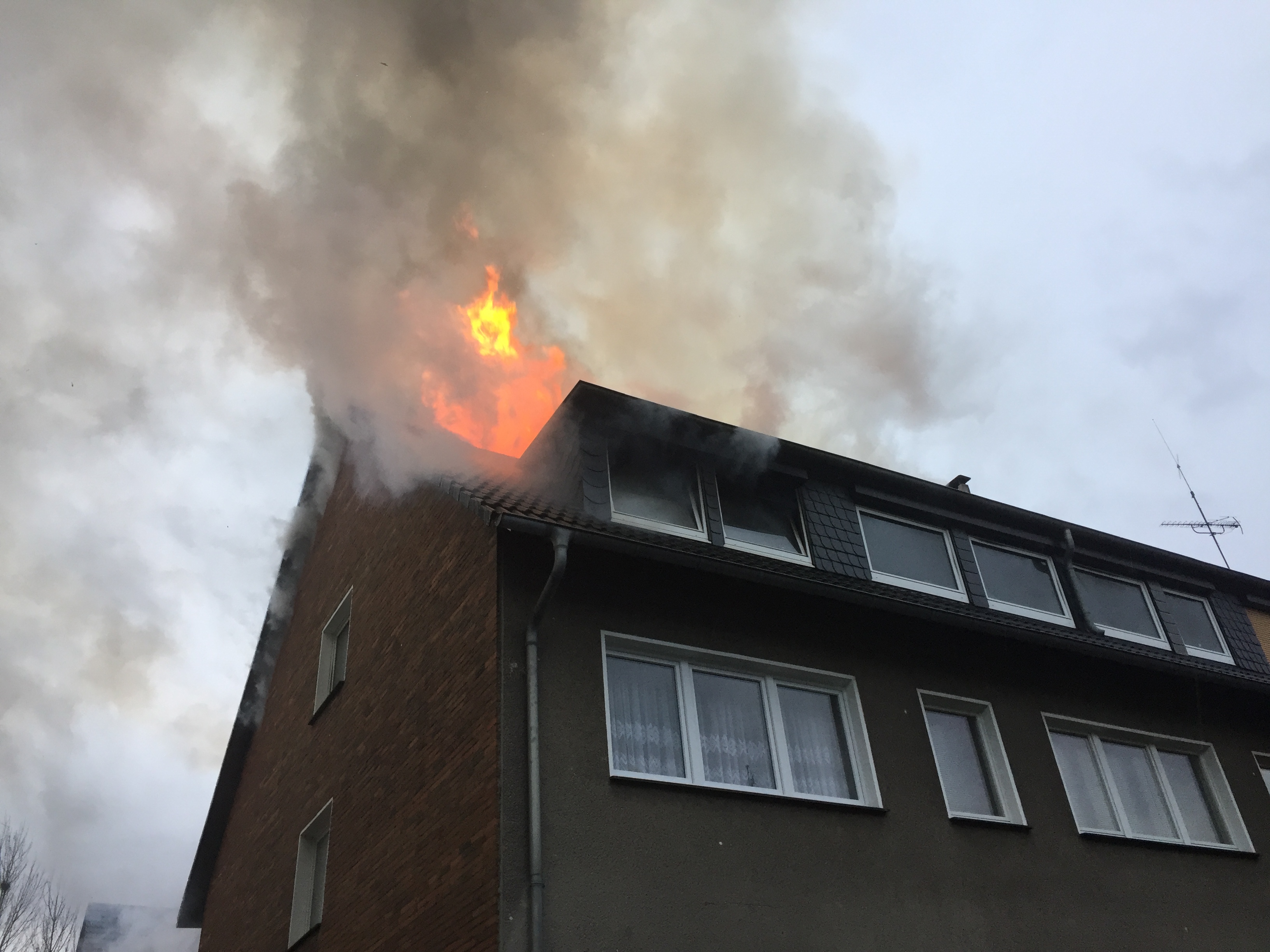 Essen-Bochold,Schölerpad,26.12.2017 (ots) - Gegen 09:15 Uhr meldeten mehrere Anrufer der Feuerwehrleitstelle einen Wohnungsbrand in einer Dachgeschosswohnung. Flammen seien schon sichtbar. Weitere Anrufer meldeten eine starke Verrauch und Brandgeruch im gesamten Stadtteil von Essen-Bochold. Beim Eintreffen der ersten Einsatzkräfte bestätigte sich der Wohnungsbrand in voller Ausdehnung in einem zweigeschossigen Mehrfamilienhaus mit ausgebautem Dachgeschoss. Der Brand in der Dachgeschosswohnung hatte sich zwischenzeitlich schon auf die Dachkonstruktion ausgebreitet. Die Bewohner wurden vor Eintreffen der Feuerwehr durch die Polizei in Sicherheit gebracht. Der Mieter der Wohnung hatte noch Löschversuche unternommen und sich dabei eine Rauchgasintoxikation zugezogen. Nach einer Untersuchung durch einen Notarzt konnte der Mieter vor Ort bleiben und musste keinem Krankenhaus zugeführt werden. Die Brandbekämpfung wurde über drei Drehleitern durchgeführt. Durch die massive Brandeinwirkung auf die Dachkonstruktion fielen beim Löschen brennende Verkleidungs-,Holzteile und Dachpfannen auf die Einsatzkräfte im Innenangriff. Da die Dachkonstruktion sichtbar an Tragfähigkeit verlor, wurde der Innenangriff beendet. Das Dach wurde über die Drehleitern abgedeckt und Brandherde von oben gelöscht. Ein vom Mieter als vermisst gemeldeter Hund wurde weder im Umkreis der Einsatzstelle noch im Bereich der Brandwohnung gefunden. Um die Stabilität des Daches zu beurteilen wurde ein Statiker des THW zur Einsatzstelle alarmiert. Das Ergebnis der Beurteilung steht noch aus. Wegen der massiven Rauchausbreitung wurde die Bevölkerung über die Warnapp NINA darüber informiert Türen und Fenster geschlossen zu halten. Mit einem Schadstoffmessfahrzeug wurden Messungen in den betroffenen Bereichen durchgeführt. Diese stellten keine für den Menschen gefährlichen Messwerte fest, sondern lediglich die gemeldete Geruchsbelästigung. Während der Löscharbeiten wurden die betroffenen Bewohner in einem Bus der Ruhrbahn untergebracht und durch einen Logistikzug der Feuerwehr verpflegt und betreut. Der Brand wurde mit 5 C-Rohren und 18 Atemschutzgeräten bekämpft. Die Feuerwehr war mit 2 Löschzügen, 2 Einsatzleitwagen, 2 Löschfahrzeugen der Kameraden der FF, 1 NEF, 1 RTW, 1 Atemschutzgerätewagen und einem Schadstoffmessfahrzeug vor Ort. Die Personalstärke vor Ort belief auf ca. 45 Einsatzkräfte. Die Nachlöscharbeiten dauert zur Zeit noch an und werden noch den ganzen Nachmittag in Anspruch nehmen.(OBR)