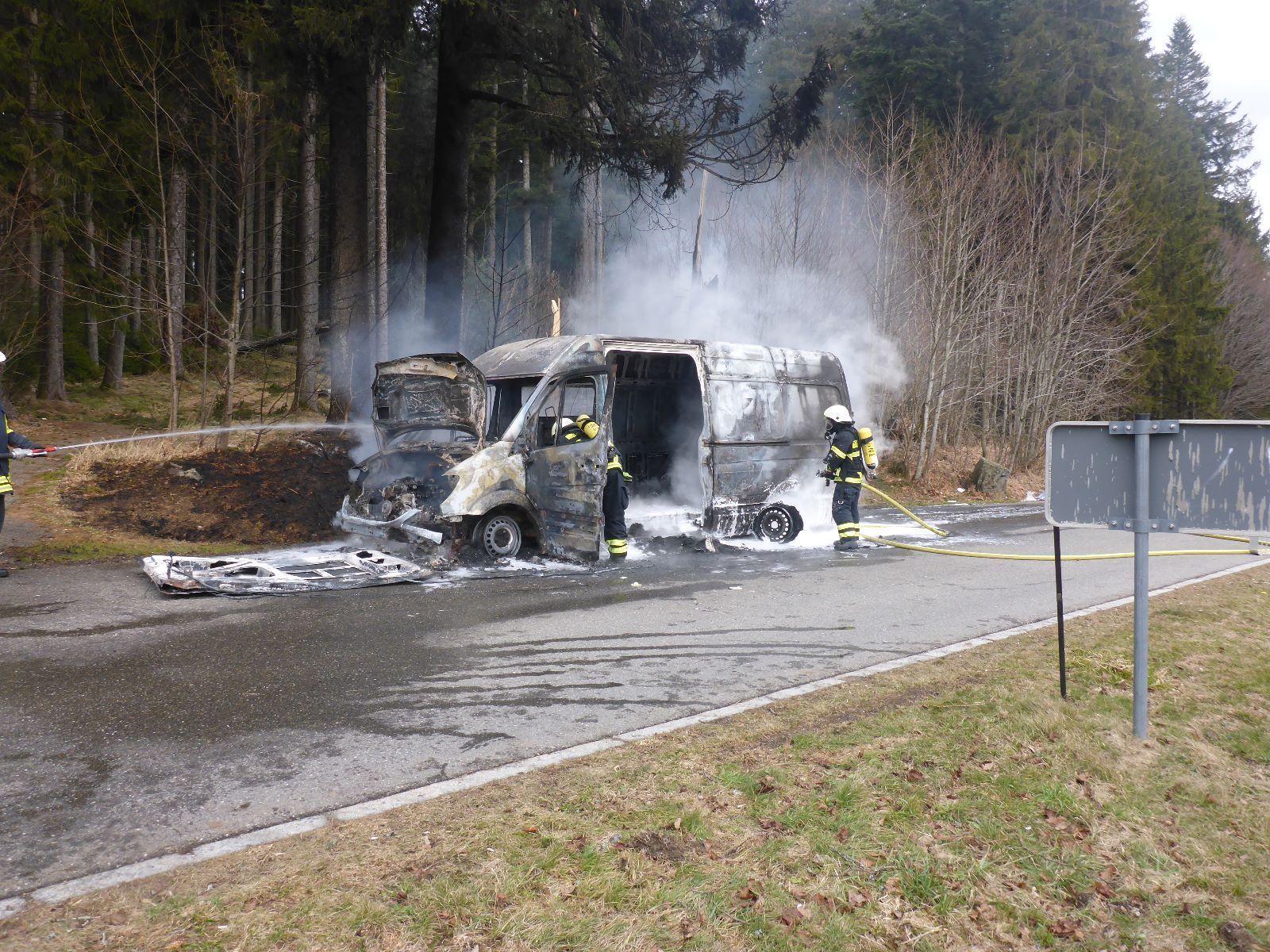Freiburg (ots) - Ein Anrufer meldete der Polizei am 15.01.17, gegen 14.00 Uhr, einen lichterloh brennenden Transporter. Der Fahrer des DB, Typ Sprinter, befuhr die B31 in Richtung Donaueschingen. Kurz vor dem o.g. Parkplatz bemerkte er eine starke Rauchentwicklung aus dem Motorraum. Er fuhr mit seinem Kraftfahrzeug den Parkplatz an und stieg zügig aus. Das Fahrzeug brannte innerhalb von wenigen Minuten komplett aus. Der Transporter war zu diesem Zeitpunkt nicht beladen. Einige Bäume, welche im Umkreis der Brandstelle stehen, nahmen Schaden durch den nahegelegenen Fahrzeugbrand. Nach den Erkenntnissen am Brandort muss man von einem technischen Defekt im Motorraum ausgehen. Der Schaden beläuft sich auf mehrere tausend Euro. Die Freiwilligen Feuerwehren Titisee und Neustadt waren mit 22 Mann vor Ort und löschten das Fahrzeug.