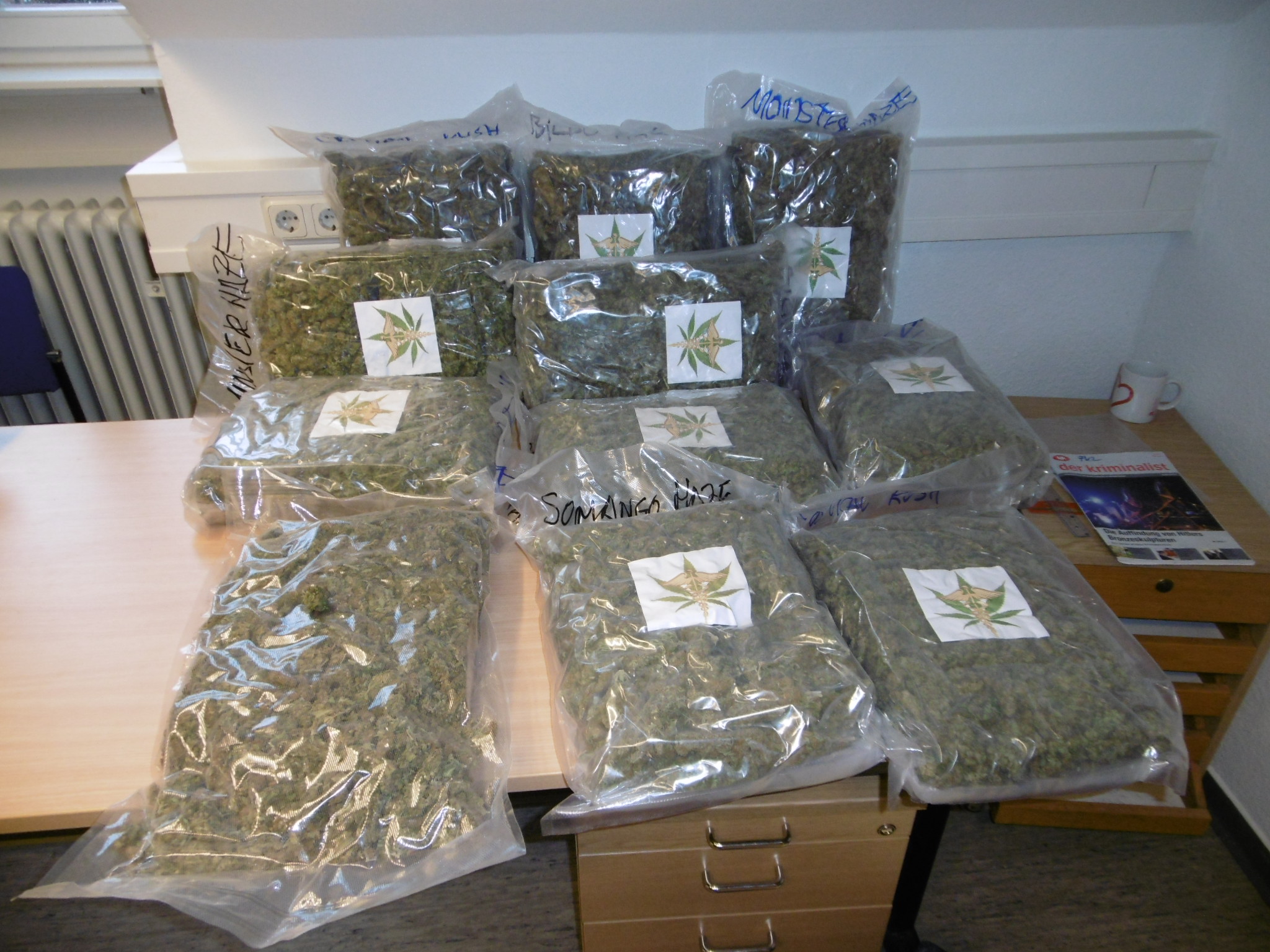 Neben Beweismitteln wurden bei den Wohnungsdurchsuchungen auch Bargeld in Höhe von insgesamt 40.000 Euro und weitere 1,5 Kilogramm Marihuana, 800 Gramm Amphetamine sowie etwas Ecstasy mit einem Marktwert von ca. 20.000 Euro aufgefunden und beschlagnahmt. Bei der Suche nach den Drogen und dem Bargeld kamen auch Drogenspürhunde und ein Geldspürhund der Diensthundestaffel aus Göttingen zum Einsatz.