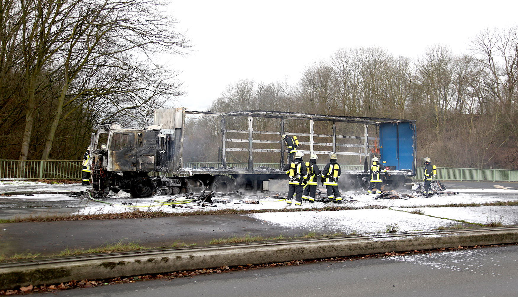 Essen-Bochold, Bottroper Straße, 24.01.2018, 10.26 Uhr (ots) - Auf der Bottroper Straße ist am Vormittag ein Sattelzug (40-Tonner) in Brand geraten. Das Fahrzeug war in Richtung Stadtmitte unterwegs und hatte 15 Tonnen Kunststoffstoßstangen geladen. Etwa 350 Meter hinter der Hafenstraße vernahm der 30jährige Fahrer einen Knall und bemerkte, dass das Fahrzeug nach rechts zog. Er brachte das erst zweieinhalb Jahre alte Gespann auf der Brücke oberhalb der S-Bahn-Linie 2 zum Stehen und stieg aus, um nach der Ursache zu suchen. Zu diesem Zeitpunkt brannte die Zugmaschine schon. Das Feuer breitete sich rasend schnell aus, erfasste den Auflieger und die Ladung. Der Fahrer konnte nur tatenlos zusehen, wie sein Fahrzeug ein Raub der Flammen wurde, er brachte sich in Sicherheit. Mehrere kleine Detonationen zeigten an, dass die Reifen und die Luftbälge der Federung durch die große Hitze zerplatzten. Eine schwarze Rauchsäule stieg auf, der Wind drückte den Rauch in Richtung Nordosten. Die Luftbewegung durchmischte den intensiv riechenden Brandrauch. Bei Eintreffen der ersten Einsatzkräfte, die die Rauchsäule, aus der Stadtmitte kommend, bereits sehen konnten, brannte das Gespann in voller Ausdehnung. Mit Wasser und Schaum löschten die Männer das Gefährt, konnten einen Totalverlust allerdings nicht verhindern. Übrig blieb nur ein verkohltes Gerippe. Für die Dauer der Lösch- und Bergungsarbeiten sperrte die Polizei die Bottroper Straße zunächst vollständig, später konnte die Spur Richtung Norden freigegeben werden. Aktuell ist ein Abschleppunternehmer vor Ort und beseitigt das Wrack. Verletzt wurde niemand, die Höhe des Sachschadens ist noch nicht ermittelt. Ereignis am Rande: Unterhalb der Einsatzstelle (Brücke über Bahn-Gleise) schlief ein Obdachloser tief und fest. In seinen Schlafsack gewickelt, hatte er von den dramatischen Ereignissen über sich nichts mitbekommen. Ein Erkundertrupp weckte ihn und schickte ihn vorsichtshalber aus dem Gefahrenbereich. (MF)