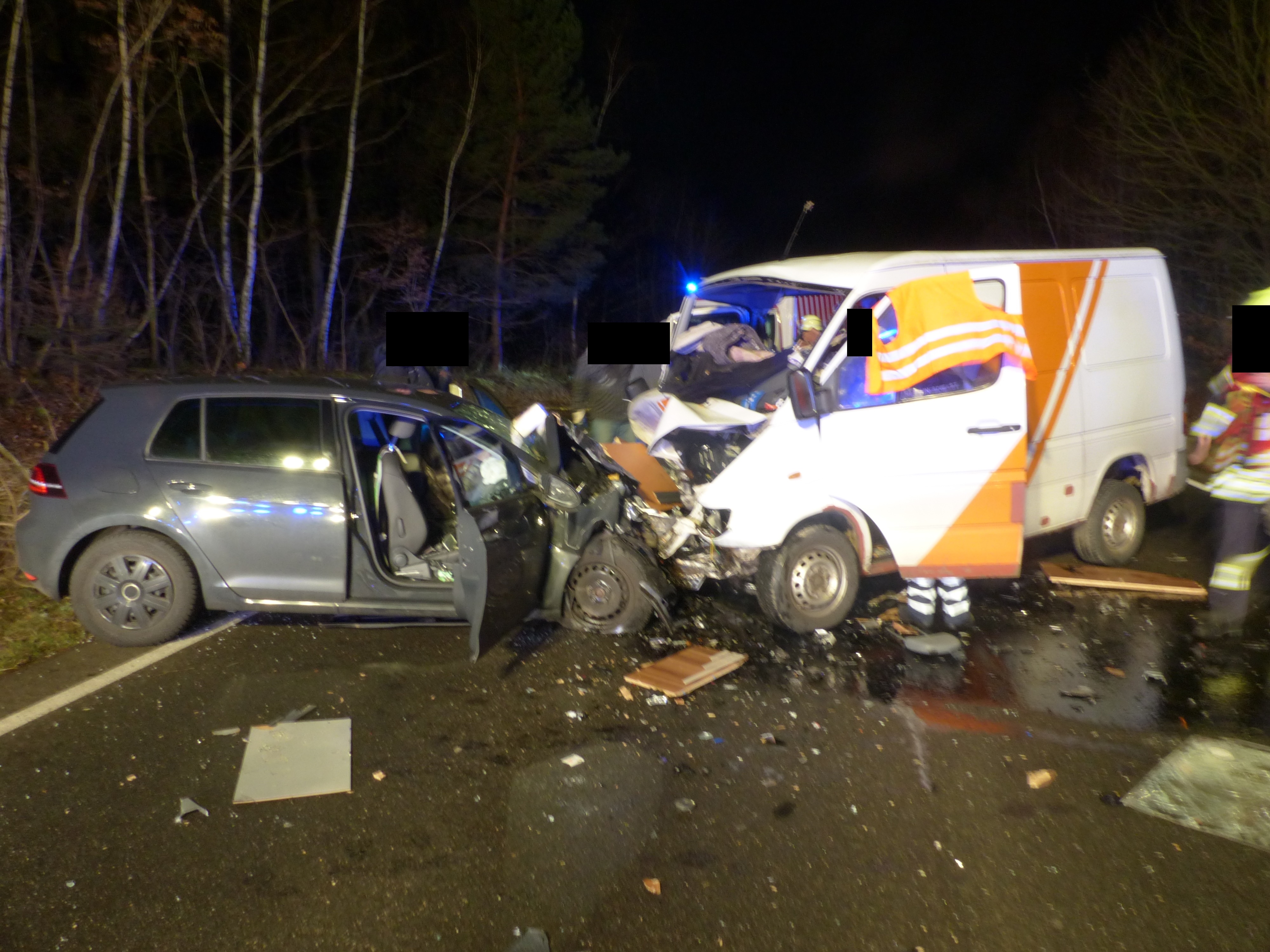 Hier kollidierte er mit einem Klein-LKW, der von Nideggen in Richtung Froitzheim fuhr. Durch die Wucht des Aufpralls wurden sowohl der 49-Jährige, als auch die Insassen des entgegen kommenden Fahrzeugs eingeklemmt. Hierbei handelte es sich um ein 58 Jahre altes Paar, das ebenfalls aus Nideggen kommt. Teile der Ladung lagen anschließend verstreut auf der Fahrbahn. Alle drei Personen mussten von den Rettungskräften der Feuerwehr aus ihren Fahrzeugwracks befreit werden. Anschließend wurden sie schwerverletzt in umliegende Krankenhäuser transportiert. Hier verblieben sie stationär. Ihre nicht mehr fahrbereiten Fahrzeuge mussten von der Unfallstelle abgeschleppt werden.
