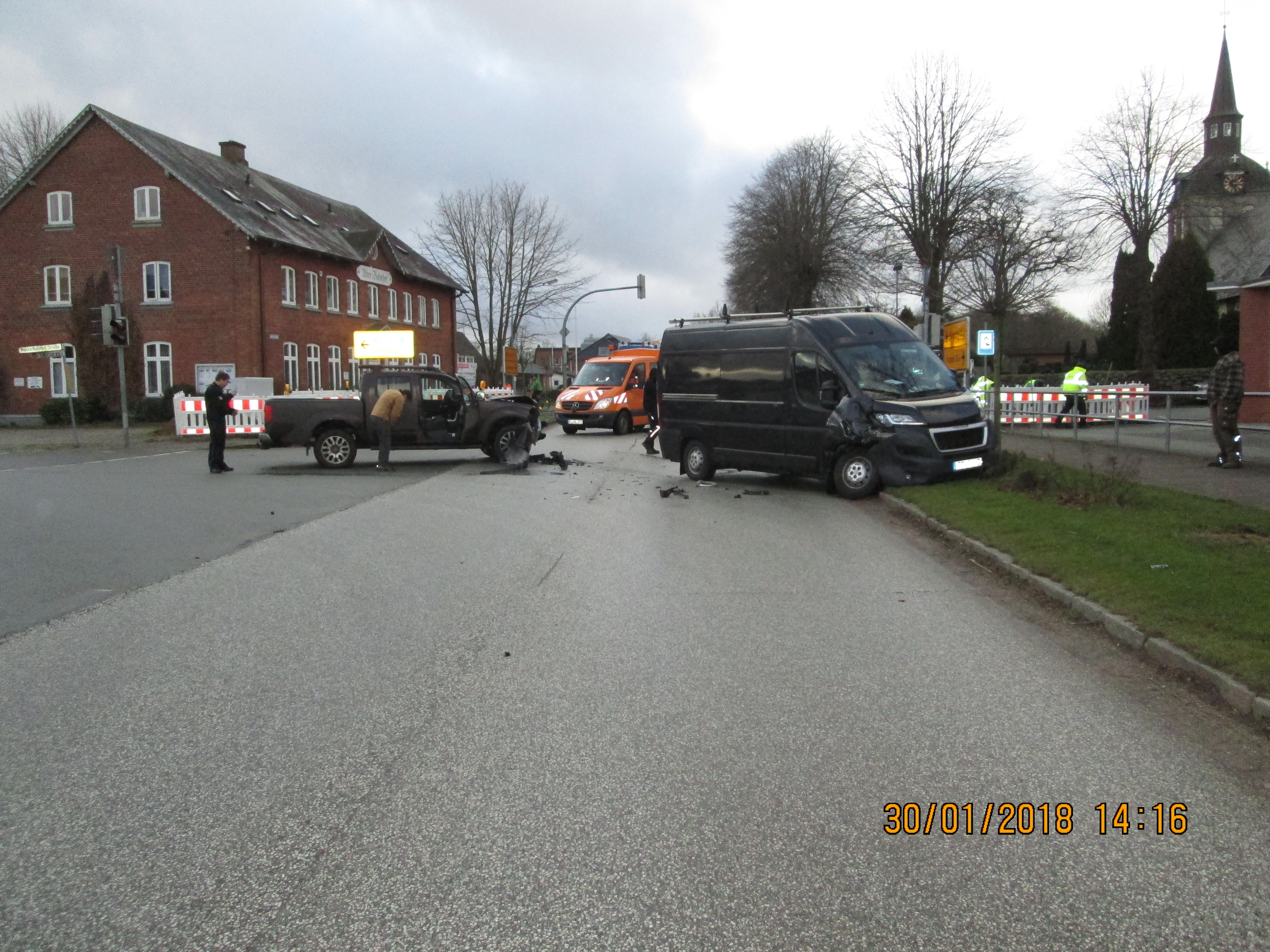 Ein schwarzer Peugeot Kleintransporter, welcher von Flensburg kommend in Richtung Kappeln geführt wurde und ein brauner Nissan Geländewagen, welcher aus der Westerholmer Straße auf die B 199 in Richtung Flensburg in den Kreuzungsbereich gelenkt wurde, sind trotz Ampelschaltung zusammengestoßen. Dabei wurde der 47-jährige Nissan-Fahrer leicht verletzt. Beide Fahrzeuge wurden bei dem Unfall schwer beschädigt. Die Polizei in Steinbergkirche hat die Ermittlungen zum Unfallhergang aufgenommen. Laut Aussagen von Zeugen soll es andere Fahrzeugführer geben, die hinter dem Kleintransporter gefahren sind und Angaben zu der Ampelschaltung machen könnten. Zeugen und Hinweisgeber werden dringend gebeten sich unter der Rufnummer 04632-8761680 zu melden. Vielen Dank