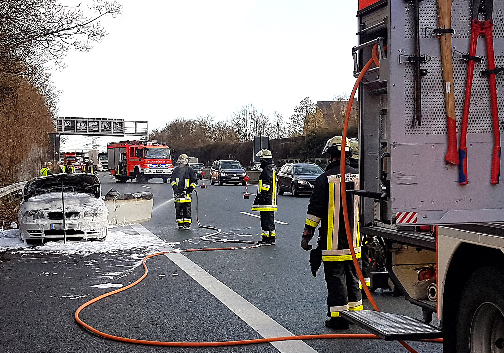 Essen-Kray, Autobahn A40 Richtung Mülheim vor Anschlussstelle Essen-Kray, 01.02.2018, 09.27 Uhr (ots) - Heute Vormittag ist auf der A40 ein BMW-Cabrio ausgebrannt. Die 38 Jahre alte Fahrerin blieb unverletzt. Sie war auf der Autobahn in Richtung Mülheim unterwegs, als sie im Fahrzeug Brandgeruch wahrnahm. Kurz darauf sah sie Flammen aus dem Motorraum vor der Windschutzscheibe flackern. Geistesgegenwärtig fuhr sie auf den Standstreifen, rollte in Richtung Ausfahrt der Anschlussstelle Essen-Kray (Krayer Platte) und alarmierte die Feuerwehr. Bei Eintreffen der ersten Kräfte stand das Fahrzeug bereits im Vollbrand, mit Wasser und Schaum löschten die Männer das Feuer. Während des Einsatzes waren zwei der drei Fahrspuren gesperrt. Das Wrack muss abgeschleppt werden, bis zur Bergung bleibt die Autobahnpolizei vor Ort und sichert die Einsatzstelle. Warum das 1er Cabrio in Brand geriet, ist noch nicht klar. (MF)