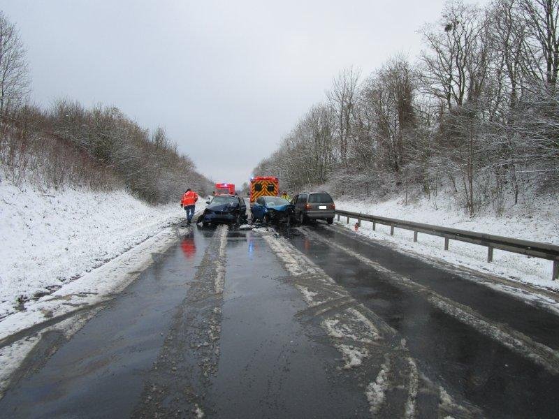 Coppenbrügge (ots) - Ein 25-jähriger litauischer Staatsangehöriger befuhr am 04.02.2018, gegen 10:35 Uhr, die Bundesstraße 1 aus Hameln kommend in Fahrtrichtung Hildesheim. Zwischen der Auffahrt Bessingen und der Ortseinfahrt Coppenbrügge geriet der PKW des 25-jährigen aufgrund nicht angepasster Geschwindigkeit auf schneeglatter Fahrbahn in den Gegenverkehr und prallte dort mit dem Ford Fiesta einer 42-jährigen Frau aus dem Landkreis Hildesheim frontal zusammen. Auf Grund des Aufpralls drehte sich der Ford um die eigene Achse, touchierte eine Seitenschutzplanke und prallte anschließend gegen den ebenfalls in Fahrtrichtung Hameln fahrenden Volkswagen eines 53-jährigen Mannes aus Salzgitter. Der 25-jährige Litauer und seine Beifahrerin sowie die Fahrerin des Ford und eine Mitfahrerin des Volkswagen wurden bei dem Unfall leicht verletzt. Der 53-jährige wurde schwer verletzt. Der Sachschaden beläuft sich auf ca. 40.000 Euro.