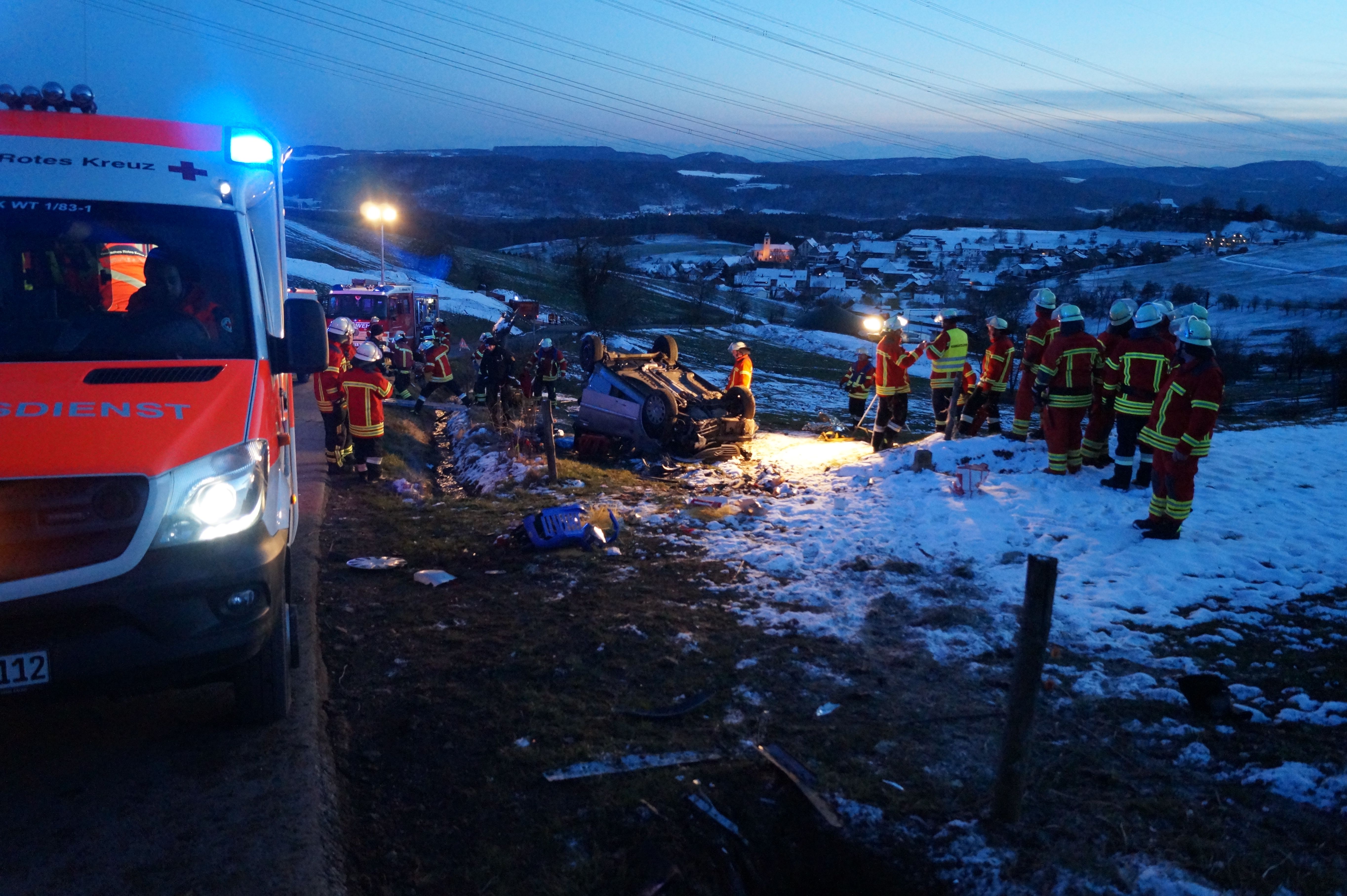 Freiburg (ots) - Albbruck: Zwei Schwerverletzte nach Autoüberschlag - eine Person eingeklemmt - Rettungshubscharuber im Einsatz - Helfer verunglückt auf der Anfahrt