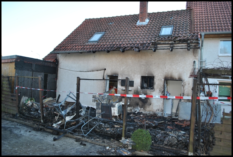 Der Holzunterstand brannte komplett aus; die brandbetroffenen Gebäude sind mit Einschränkungen bewohnbar.
