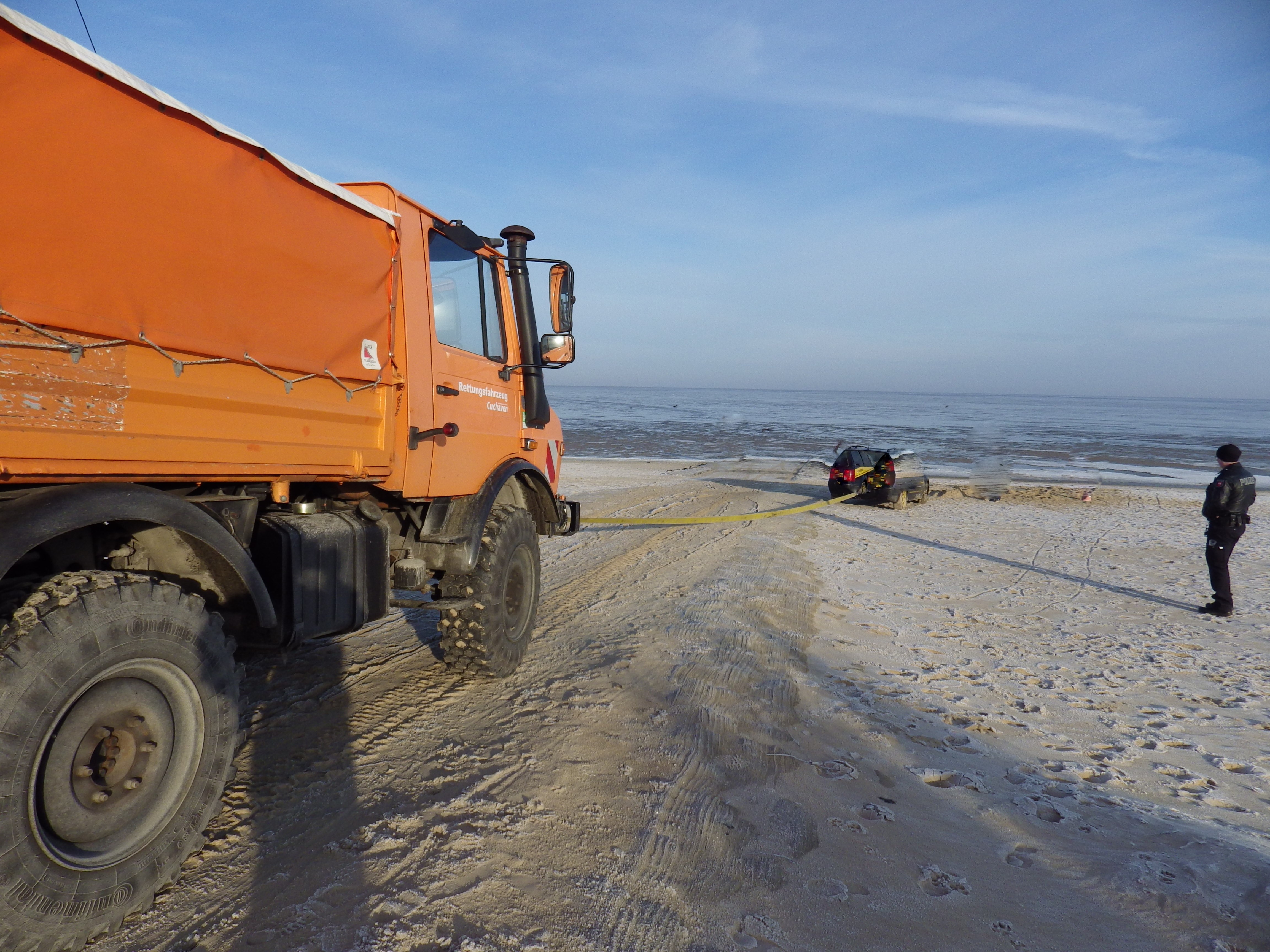 Cuxhaven. Am 18.02.2018, gegen 07.30 Uhr, wurde der Polizei Cuxhaven mitgeteilt, dass sich ein Pkw am Strand in Cuxhaven-Duhnen festgefahren haben soll. Die Polizei staunte nicht schlecht, als man am Einsatzort angekommen war. Drei junge Leute aus dem Kreis Unna (NRW) meinten eine Abenteuertour zum Meer zu machen. In Cuxhaven-Duhnen angekommen, fuhren sie über die Deichzufahrt an den Strand und haben sich direkt am Strand festgefahren. Der 20-jährige Fahrer nutzte hierbei den Firmenwagen seines Vaters. Gegen den Mann wurde von der Stadt Cuxhaven ein Ordnungswidrigkeitsverfahren eingeleitet. Der Pkw konnte mit einem Unimog der Stadt Cuxhaven geborgen werden.