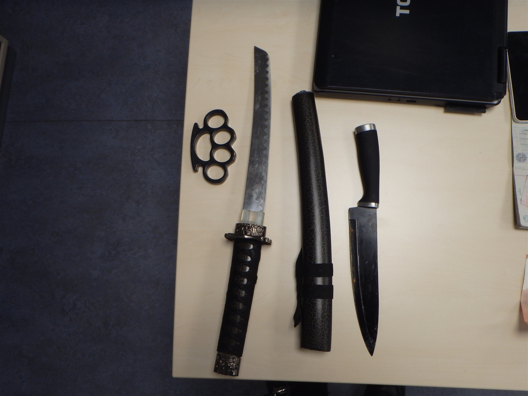 Den Beamten der Hunderschaft fiel am Vormittag in der Carlstadt ein Pkw Seat mit einem Verdächtigen auf. Als die Polizisten den Mann kontrollieren wollten, ließ er das Fahrzeug auf der Bilker Straße zurück und nahm in Richtung Schwanenmarkt - Spee´scher Graben durch die engen Straßen Reißaus. Unter Zuhilfenahme von Fahrrädern, Fahrzeugen von Bürgern und Bürgern selbst gelang schließlich am Schwanenmarkt / Graf-Adolf-Straße die Festnahme. Schnell war klar, warum der 24-Jährige geflüchtete war. Er befand sich "auf Bewährung draußen", stand unter BtM-Einfluss und hatte keinen Führerschein. Während seiner Vernehmung, der Blutprobe und den Ermittlungen ergaben sich konkrete Hinweise auf eine Dealerwohnung an der Kölner Straße. Die Polizisten besorgten sich Eilbeschlüsse und stürmten am Nachmittag das Drogennest. Wie sich herausstellte handelte es sich um die konspirative Wohnung eines 20-Jährigen. Die Beamten entdeckten Drogen (110 Gramm Kokain, 700 Gramm Hasch und 250 Gramm Marihuana), Waffen (Samurai-Schwert, Schlagstock, Schlagring, Messer), 2.000 Euro Dealgeld und Rauschgiftutensilien. Während der Maßnahmen erschien der 20-jährige Wohnungsbetreiber auf der Bildfläche. Er erkannte die Situation und trat die Flucht an. Die Polizisten hatten den Bereich jedoch abgeriegelt und konnten ihn sofort festnehmen. Der Vorbestrafte war nach den Erkenntnissen der Behörden bereits zur Abschiebung ausgeschrieben. Seit dem Wochenende befindet er sich in Haft.