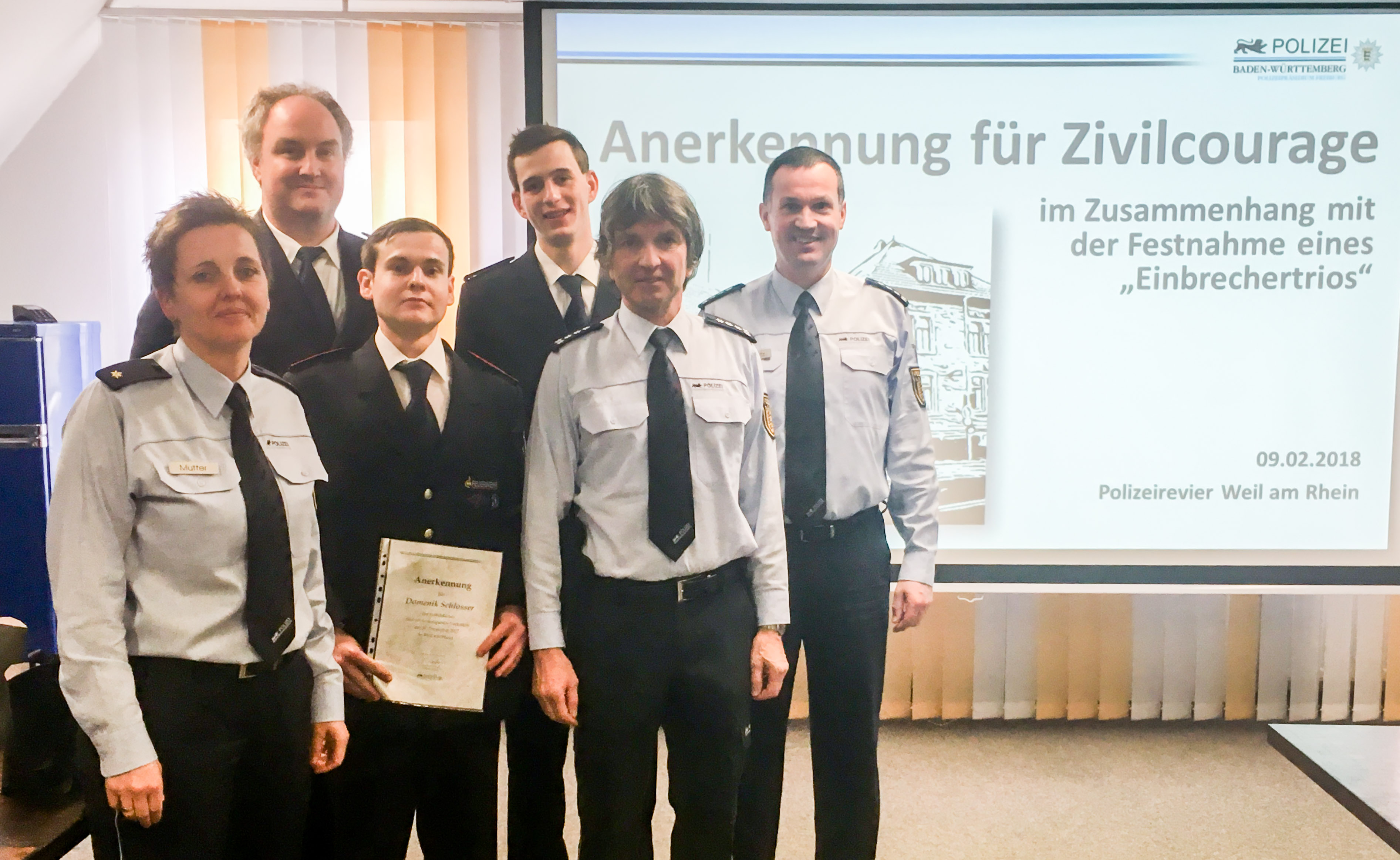Das außergewöhnliche Maß an Zivilcourage und vorbildliche Verhalten des Pärchens und der beiden Feuerwehrleute war für die Polizei Grund zu einer Ehrung. Diese wurde im Rahmen einer kleinen Feierstunde beim Polizeirevier Weil am Rhein durchgeführt. Revierleiterin Kathrin Mutter ließ nach der Begrüßung das Geschehene nochmals Revue passieren und gab den Besuchern einen Einblick in die damaligen Abläufe. Dabei kam jeder Beteiligte zu Wort und es entwickelte sich ein munteres Gespräch. Am Ende überreichte Polizeisprecher Dietmar Ernst den Helfern eine von Polizeipräsident Bernhard Rotzinger persönlich unterzeichnete schriftliche Anerkennung. Außerdem gab es für alle noch ein kleines Geschenk.