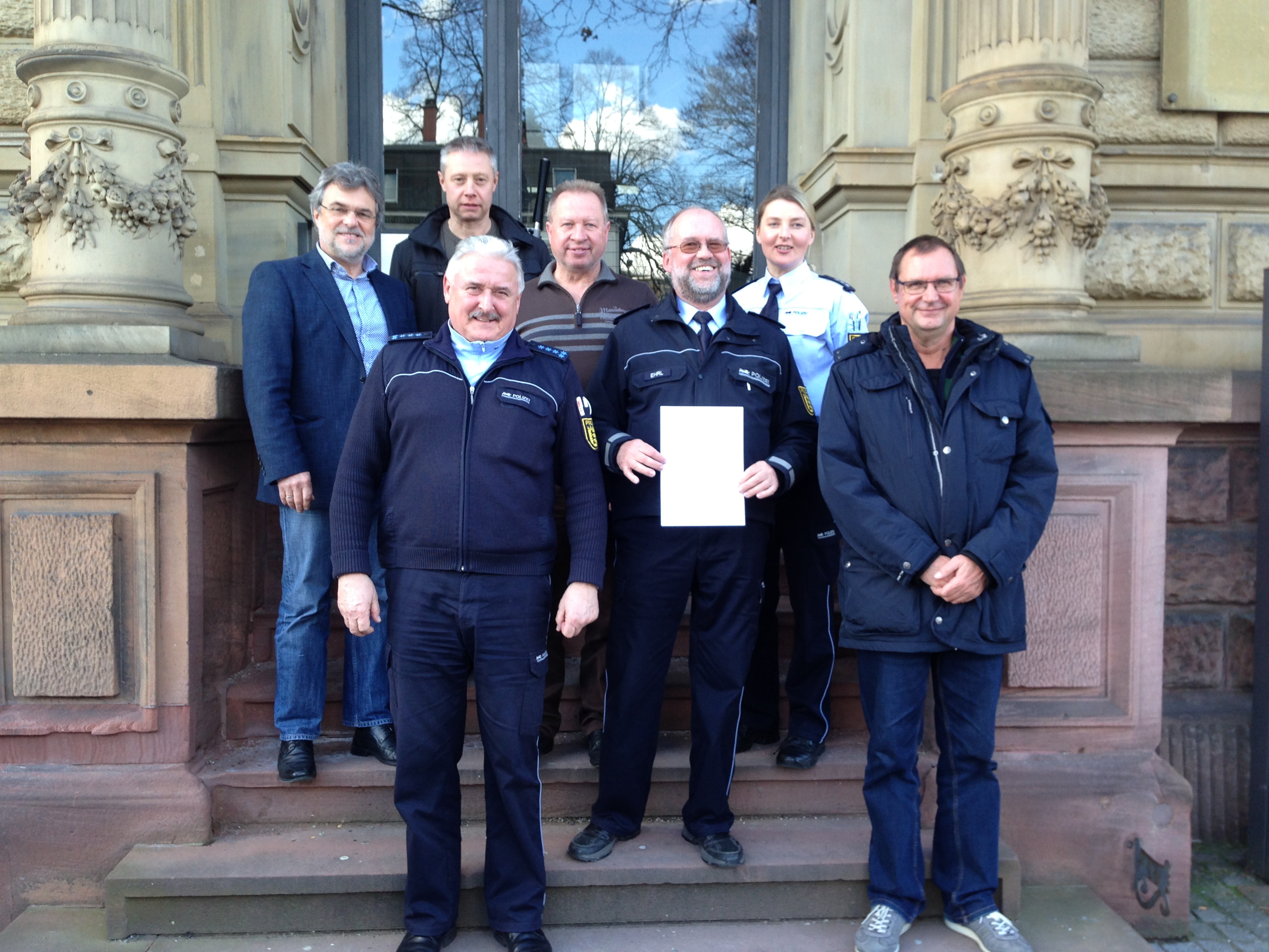 In der Anlage übersenden wir noch zwei weitere Bilder. Sie zeigen Wolfgang Ehrl a) anlässlich einer Ehrung durch den ehemaligen Leiter des Referats Prävention sowie b) im Kreise seiner Kollegen bzw. Kollegin des Referats Prävention des Polizeipräsidiums Freiburg