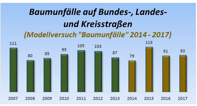 Im Gegensatz zu den Erwartungen erbrachte der Modellversuch "Baumunfälle", für den auf 108 Straßen-abschnitten im Landkreis Hildesheim eine dreijährige Geschwindigkeitsbeschränkung (70/80 km/h) eingerichtet wurde, keine signifikante Reduzierung der Verkehrsunfälle mit Anprall an einen Straßenbaum. Geschwindigkeitsmessungen ergaben, dass die Baumversuchsstrecken, insbesondere bei ortskundigen Fahrzeugführern, eher eine mäßige Akzeptanz fanden und somit nur eine geringfügige Reduzierung der Durchschnittsgeschwindigkeiten erzielt wurde. So verwundert es auch nicht, dass in den ersten 12 Monaten nach Beschilderung der Versuchsstrecken sogar die höchste Anzahl jemals polizeilich registrierter Baumunfälle dokumentiert wurde. Häufigster Unfallhergang ist ein Abkommen des Fahrzeugs mit den Rädern in den unbefestigten Seitenraum und Verlust der Kontrolle durch den Fahrzeugführer mit anschließendem Anprall an einen Straßenbaum. Detailauswertungen ergaben, dass die gefahrene Geschwindigkeit keinesfalls isoliert als Ursache für Baumunfälle betrachtet werden kann; weitere Faktoren, wie Überholmanöver, Seitenwind, Wildwechsel und insbesondere Unaufmerksamkeit/Ablenkung des Fahrzeugführers spielen häufig eine entscheidende Rolle.