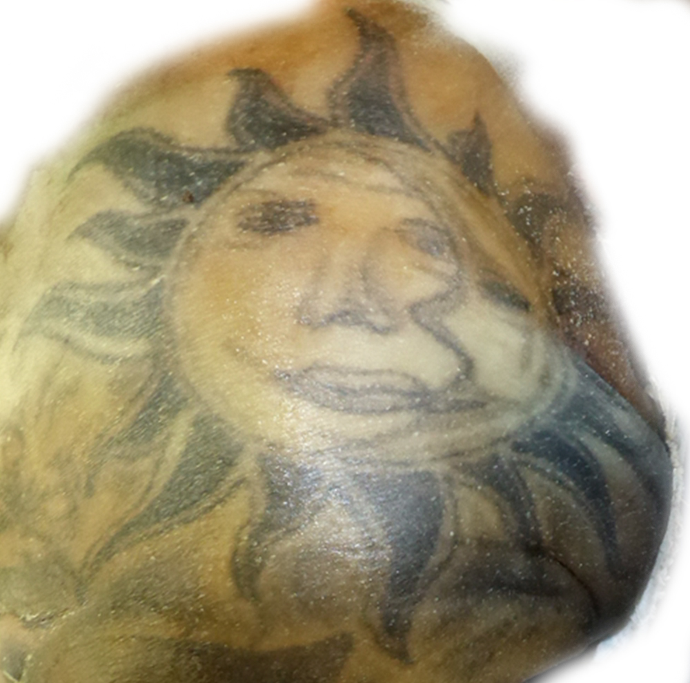 Linke Schulter: Sonne und "Comic-Bulldoggenkopf"