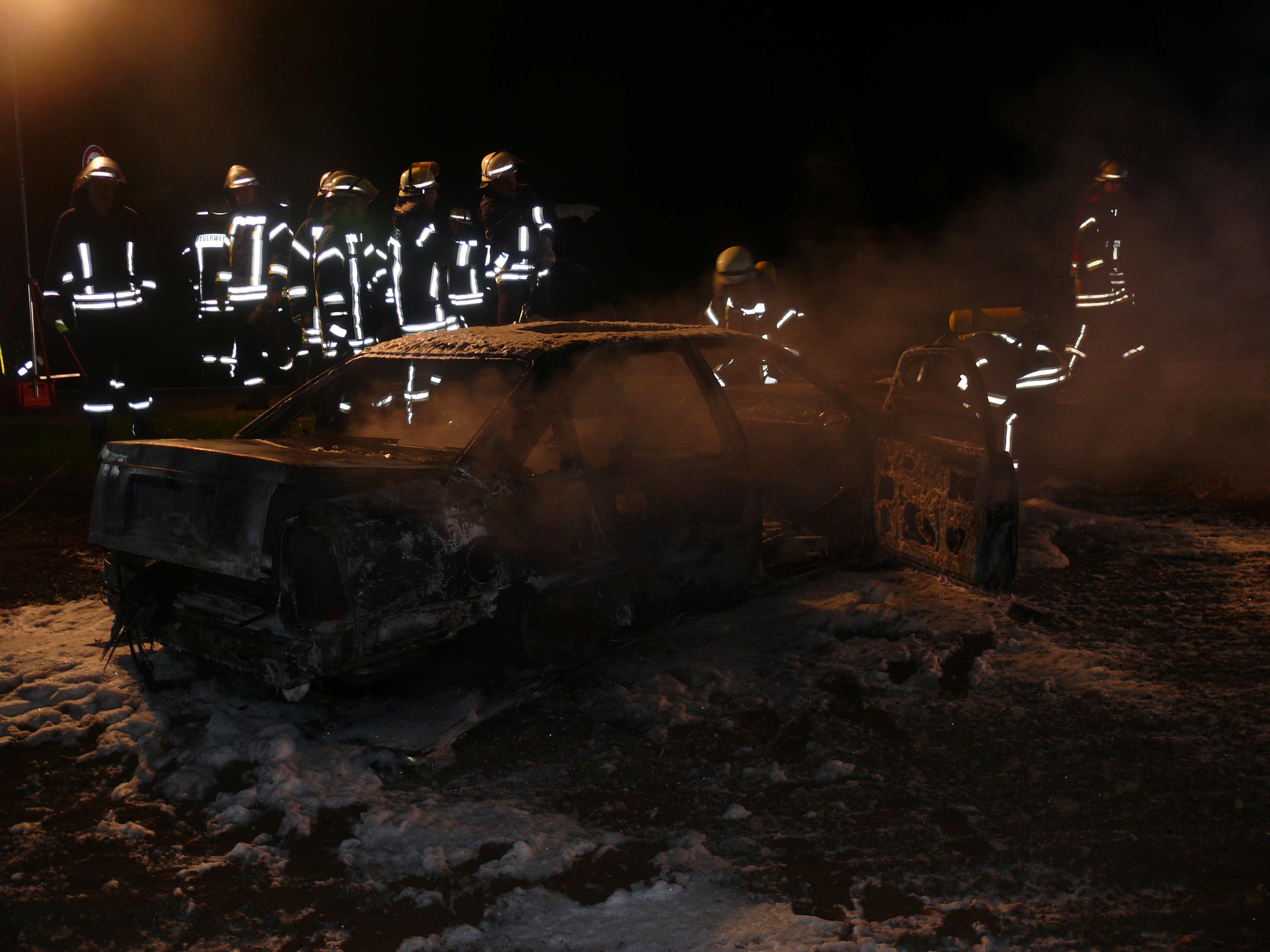 Gegen 03:50 Uhr wurde ein brennendes Fahrzeug in einem Feld neben der Landesstraße 12 in Höhe der Ortschaft Schophoven gemeldet. Es rückten Polizei, Feuerwehr, Notärzte und ein Rettungswagen aus, um festzustellen, dass sich keine Personen im Wagen oder in unmittelbarer Nähe befanden. Der in Flammen stehende Pkw wurde gelöscht und später sichergestellt.