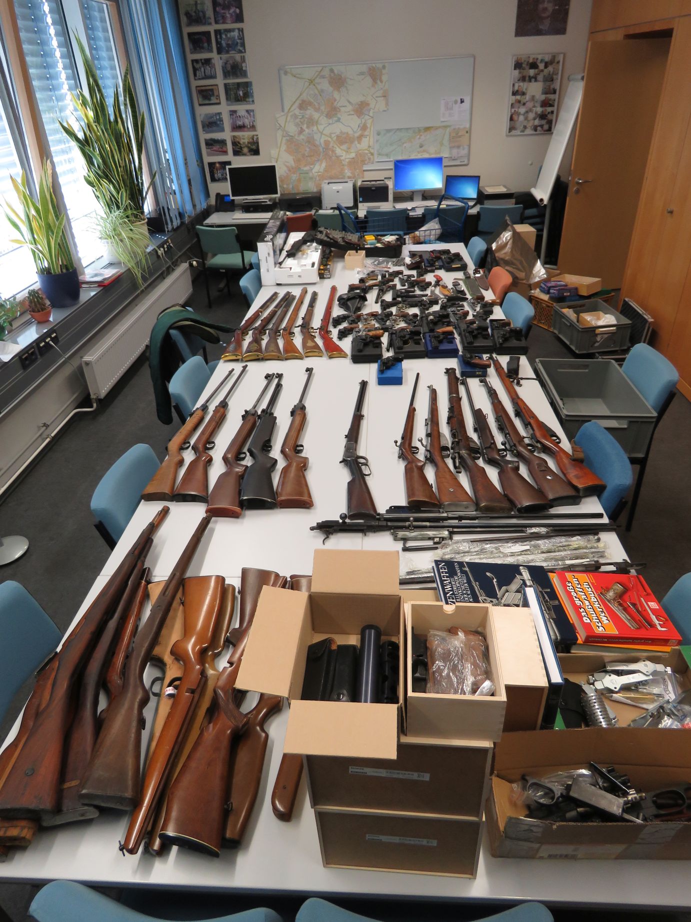 Im Einzelnen stellten die Beamten unter anderem 45 Kurzwaffen, 20 Langwaffen, zahlreiche Waffenteile und circa 100 Kilogramm Munitionsteile und Munition sicher. Dazu passend sind die etwa 15 Kilo Schwarzpulver. Hierzu siehe auch beigefügte Fotos in der Anlage.