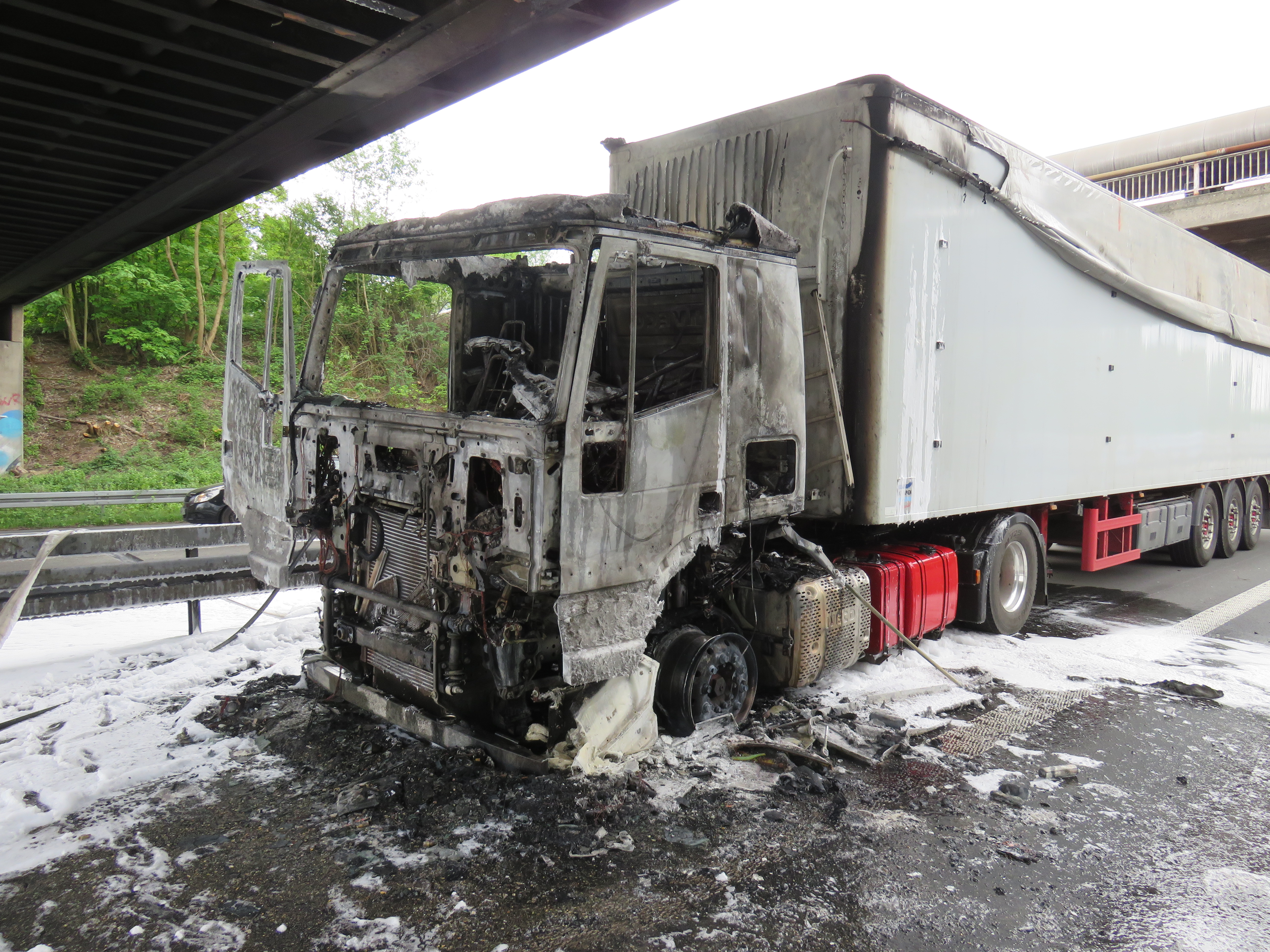 Essen-Altenessen, A42 Höhe Kreuz Essen-Nord Fahrtrichtung Dortmund, 12.13 Uhr (ots) - Am heutigen Mittag gegen 12.13 Uhr erreichten die Feuerwehr Essen mehrere Notrufe, zu einem brennenden LKW auf der Autobahn A 42, der in Höhe des Kreuzes Essen-Nord, in Fahrtrichtung Dortmund, auf dem dortigen Seitenstreifen zum Stillstand kam. Die Essener Einsatzkräfte, welche insgesamt mit zwei Löschzügen ausrückten, konnten bereits auf der Anfahrt eine deutliche Rauchentwicklung wahrnehmen. Da eine Vielzahl der Notrufe zeitgleich bei der Feuerwehr Bottrop eingingen, fuhr parallel ein Löschzug der Bottroper Kollegen zu diesem Brand. Aus diesem Grund kam es dazu, dass die Bottroper und Essener Einsatzkräfte gleichzeitig und somit gemeinschaftlich an der Brandbekämpfung des brennenden Fahrzeuges beteiligt waren. Vor Ort stellte sich heraus, dass eine Sattelzugmaschine im Bereich des Fahrerhauses in voller Ausdehnung brannte. Der nicht beladene angehängte Auflieger des Sattelzuges war im Frontbereich ebenfalls schon durch die Flammen beschädigt. Zudem stand der brennende LKW so ungünstig unter einer Eisenbahnbrücke, dass die Unterkonstruktion zeitweilig der starken Wärmestrahlung des Feuers ausgesetzt war. Es wurden daher zusammen mit der Feuerwehr Bottrop mehrere Wasser- und Schaumstrahlrohre vorgenommen, um den Brand zu löschen und gleichzeitig die Metallkonstruktion der Eisenbahnbrücke zu kühlen. Die Autobahnpolizei musste die beiden Fahrspuren in Fahrtrichtung Dortmund während der gesamten Einsatzzeit vollständig sperren. Es kam daher zu mehreren Kilometern Stau. Der 39 jährige Fahrer des LKWs und sein Beifahrer konnten sich unverletzt in Sicherheit bringen. An der Sattelzugmaschine entstand ein Totalschaden. Die Eisenbahnbrücke ist dem Unternehmen der RBH Logistik GmbH zugehörig und wurde anschließend durch den Betreiber bzw. durch einen beauftragten Sachverständigen hinsichtlich der Standsicherheit, sowie auf mögliche Schäden durch das Feuer, überprüft.