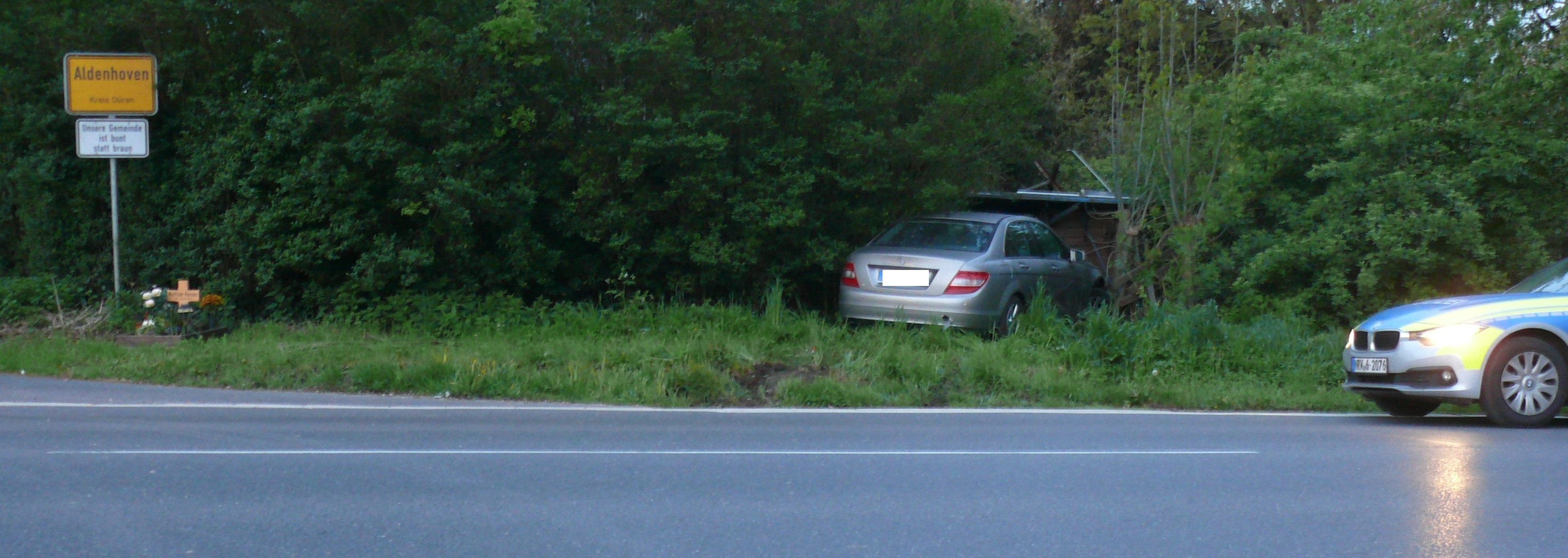 Gegen 04:30 Uhr kam ein Wagen von der Fahrbahn der L 136 ab und landete in einem angrenzenden Grünstreifen, wobei er mit der Front mehrere Zäune dort angrenzender Gärten beschädigte. Ein Zeuge hatte die Polizei über diesen Umstand informiert. Als die Beamten an der Unfallstelle ankamen, fanden sie das Fahrzeug verlassen und verschlossen vor, von dem oder den Insassen fehlte jede Spur. Anhand der Spuren auf der Fahrbahn konnte festgestellt werden, dass der Wagen auf dem Engelsdorfer Weg aus Richtung Engelsdorf gekommen sein musste. Während die Polizisten mit der Unfallaufnahme begannen, traf ein weiteres Auto an der Unfallstelle ein. Ein 19-Jähriger aus Alsdorf stieg aus und erklärte, er habe den Pkw in der Nacht in den Grünstreifen gesteuert, und sei nun unter anderem mit dem Wagenbesitzer zur Unfallstelle zurückgekehrt, um das Unfallauto abzuschleppen. Er gab weiterhin an, der Eigentümer des Autos hätte ihm erlaubt, das Fahrzeug zu nutzen. Doch der 17-jährige Besitzer des Autos leugnete dies. Er sagte aus, sein Kumpel habe den Wagen ohne sein Wissen genutzt.