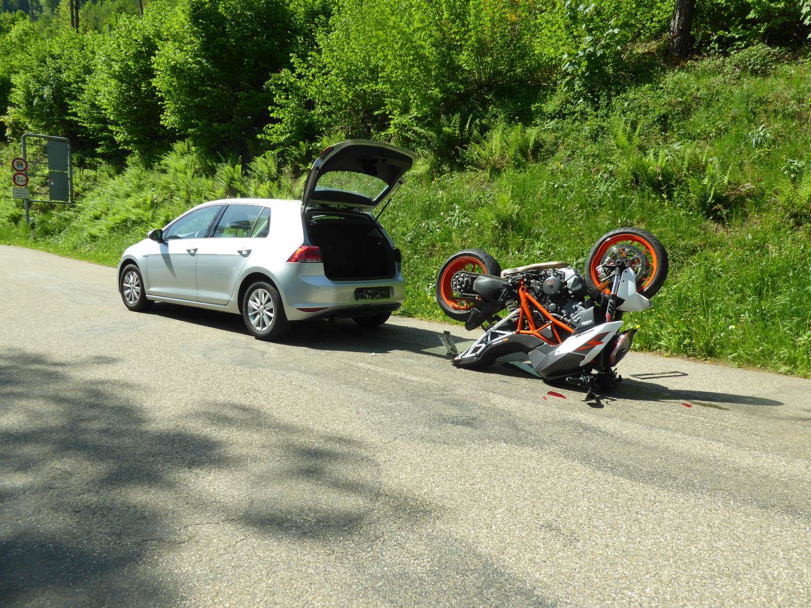 Am Sonntagmittag fuhr ein junger Mann mit seinem Motorrad und Sozia von Waldkirch aus in Richtung Kandel. Im Bereich Altersbach bremste ein vorausfahrender Autofahrer, was der Motorradfahrer offensichtlich zu spät erkannte. Er fuhr dem Pkw auf, was zum einen dazu führte, dass der Fahrer und seine Mitfahrerin über das Dach des Wagens katapultiert wurden. Der 30-jährige Motorradfahrer aus dem nördlichen Bereich des Landkreises zog sich hierbei eine Fraktur an der Hand zu. Seine jüngere Beifahrerin blieb nach derzeitigem Erkenntnisstand der Polizei unverletzt. Soweit nichts besonders Ungewöhnliches. Außergewöhnlich war jedoch, dass das Motorrad, welches sich durch die Kollision offensichtlich überschlug, auf der Fahrbahn, quasi im Kopfstand mit den Rädern nach oben, zum Stillstand kam. An Motorrad und Auto entstand Sachschaden.