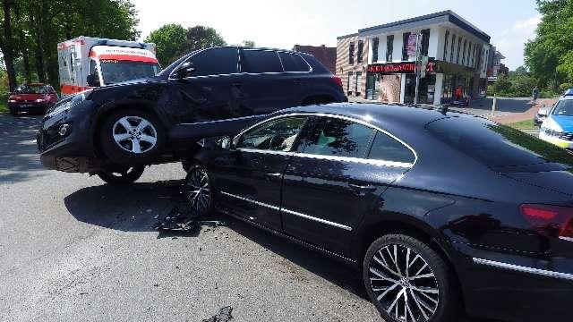 Hemmoor. Zwei Fahrzeugführer und eine Beifahrerin wurden am 13.05.2018 gegen 14 Uhr bei einem Verkehrsunfall leicht verletzt. Es entstand insgesamt 35.000 Euro Sachschaden an den beteiligten Fahrzeugen. Ein 70-jähriger Fahrzeugführer aus dem Kreis Stade tastete sich mit seinem VW Tiguan von der Zentrumstraße in Hemmoor an die Kreuzung zur B495 heran, auf die er nach links einbiegen wollte. Dabei übersah er nicht nur das für ihn bestehende Rotlicht der Ampelanlage, sondern auch den bevorrechtigten VW CC, der die B 495 in Richtung Lamstedt befuhr. Der 53-jährige Fahrer konnte nicht mehr bremsen und fuhr seitlich in den Tiguan, sodass dieser auf die Motorhaube des anderen geschoben wurde.