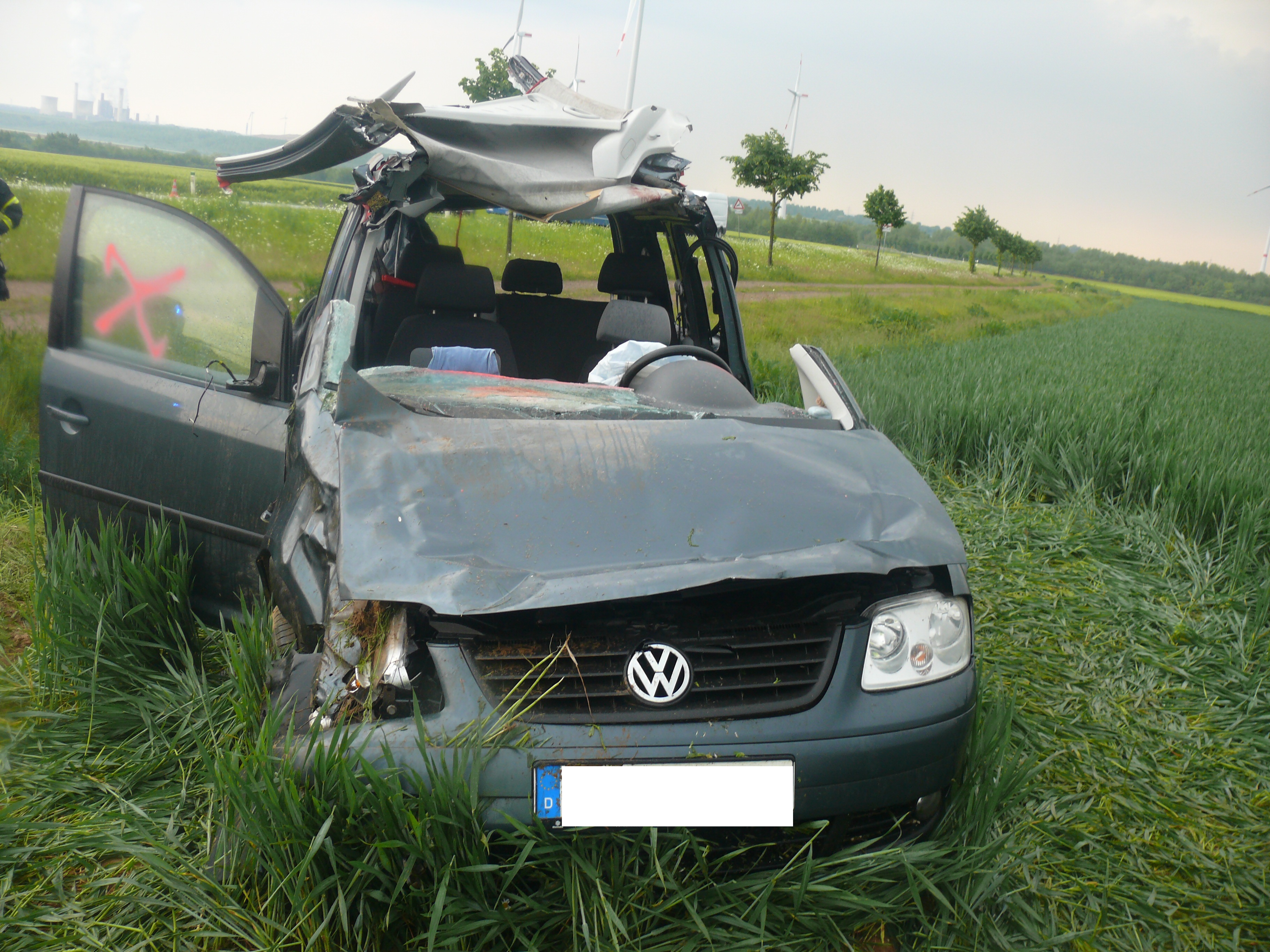 Der Pkw kam auf den Rädern im Feld zum Stillstand. Der 50-Jährige wurde im Fahrzeug eingeklemmt und musste durch die Feuerwehr befreit werden. Aufgrund der Schwere seiner erlittenen Verletzungen transportierte ihn ein Hubschrauber anschließend in ein Klinikum.