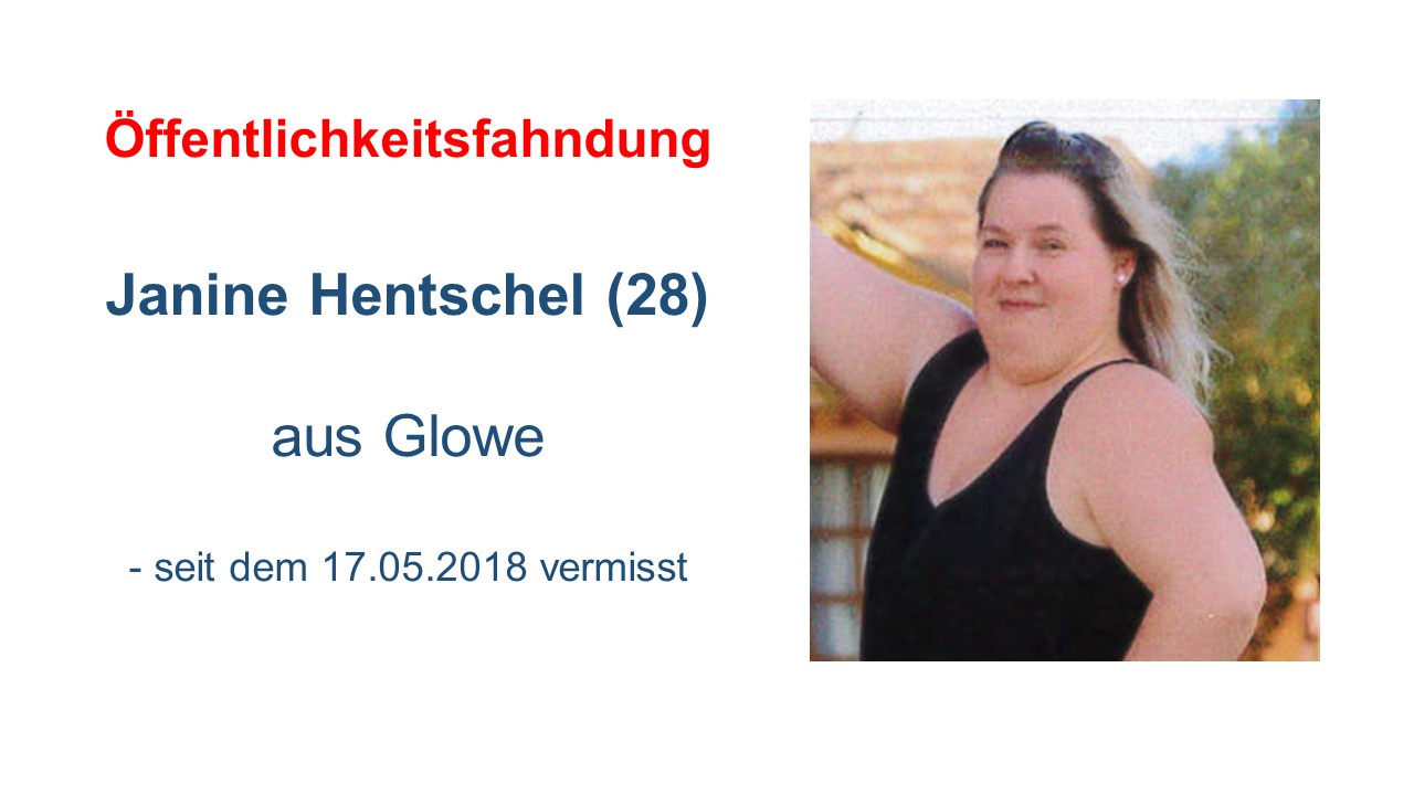 Glowe (Rügen) (ots) - Seit dem 17.05.2018, etwa 11:00 Uhr, wird die 28-jährige Janine Hentschel aus Glowe vermisst. Sie war mit der Familie im Glower Wald nahe Klein Gelm spazieren und ist seitdem verschwunden. Zuvor war der Abstand zwischen Janine Hentschel und den Angehörigen vergrößert bis man sich aus den Augen verlor. Dies ist für die 28-Jährige nicht typisch, sie hat ihr gewohntes und familiäres Umfeld aus bisher unbekannten Gründen verlassen.