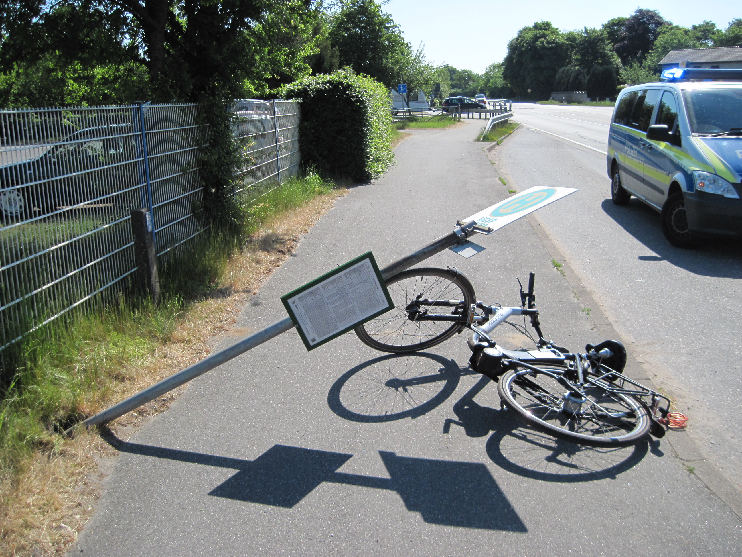 Wallsbüll (Kreis SL-FL) (ots) - Am Dienstagvormittag (22.05.18) verunglückte ein Radfahrer auf der B 199 bei der Bushaltestelle beim Wallsbüller Kreuz. Der 76-jährige Mann fuhr gegen 10:00 Uhr mit seinem Pedelec auf dem Radweg in Richtung Flensburg. Aufgrund der tief stehenden Sonne konnte er nicht sehen, dass ein Verkehrszeichenträger verbogen war und im 45-Grad-Winkel in den Radweg ragte. Der Mann stieß mit dem Bushaltestellenschild zusammen, stürzte und verletzte sich. Er wurde in ein Krankenhaus eingeliefert.