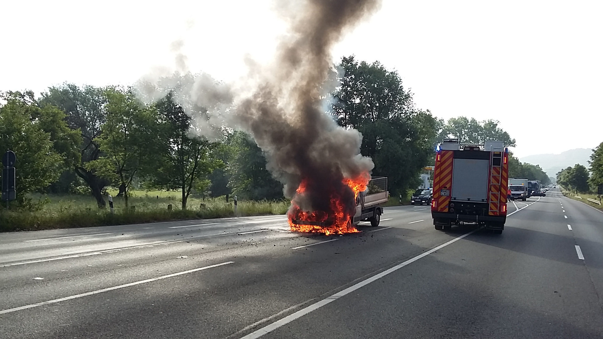 Der Grund hierfür war ein Fahrzeugbrand eines Pritschenwagens, der ca. 30 Meter vor der Ampelkreuzung auf der Überholfahrspur in Fahrtrichtung Bückeburg in Brand geraten ist.