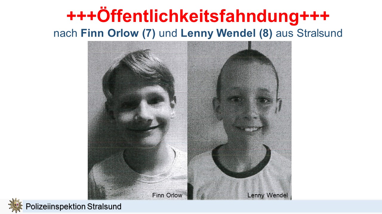 Stralsund (ots) - Seit dem heutigen Tag, dem 05.06.2018 - etwa 08:30 Uhr, werden die Jungen Finn Orlow (7 Jahre) und Lenny Wendel (8 Jahre) aus einer betreuten Einrichtung in der Rostocker Chaussee in Stralsund vermisst. Sie sind nach derzeitigem Stand gemeinsam unterwegs.