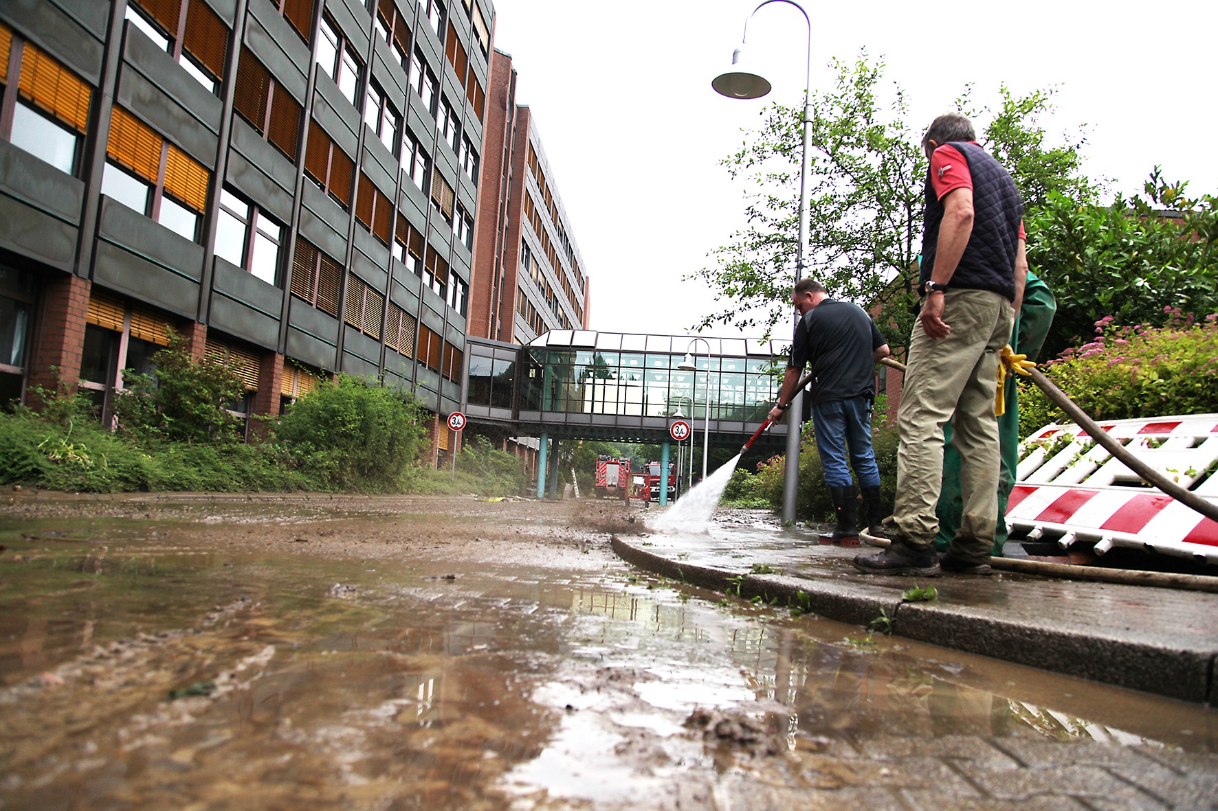 Essen-Kupferdreh, Deilbachtal, 10.06.2018, 03.25 Uhr (ots) - Gegen 03.15 Uhr hat es in der vergangenen Nacht unter anderem im Bereich Essen-Kupferdreh massiv geregnet. Das Oberflächenwasser wird hier normalerweise vom Eickelbach und vom Priehlbach, die zum Teil verrohrt sind, in Richtung Deilbach abgeführt, der dann in seinem Verlauf in den Baldeneysee mündet. Die Regengüsse waren offensichtlich so ergiebig, dass die beiden Bäche über die Ufer traten. Wasser und mitgeführter Schlamm drangen wegen des abschüssigen Geländes in das Schulungszentrum der VGB PowerTech e. V (mehr Infos unter https://www.vgb.org/kraftwerksschule.rss9) In den Kellerräumen, in denen Technik- und Schulungsräume untergebracht sind, stand das Wasser zwischenzeitlich mehr als einen Meter hoch. Etwa 30 Feuerwehrleute sind mit Tauchpumpen und Tragkraftspritzen seit 03.25 Uhr ununterbrochen im Einsatz, um das Wasser aus den Gebäuden zu schaffen. Übrig bleibt der Schlamm, der knöcheltief die Böden bedeckt. Derzeit wird mit schwerem Gerät im Außenbereich Schlamm beseitigt, das Technische Hilfswerk unterstützt mit einem Greifer, um die Bachläufe und deren Siebgitter von mitgerissenem Material zu befreien, damit bei erneuten Unwetterlagen die Wassermassen abfließen können. Die Arbeiten der Feuerwehr werden sicher noch mehrere Stunden andauern. Ob der Schulungsbetrieb am Montag aufgenommen werden kann, ist zweifelhaft, die Höhe des Sachschadens nicht geklärt. (MF)